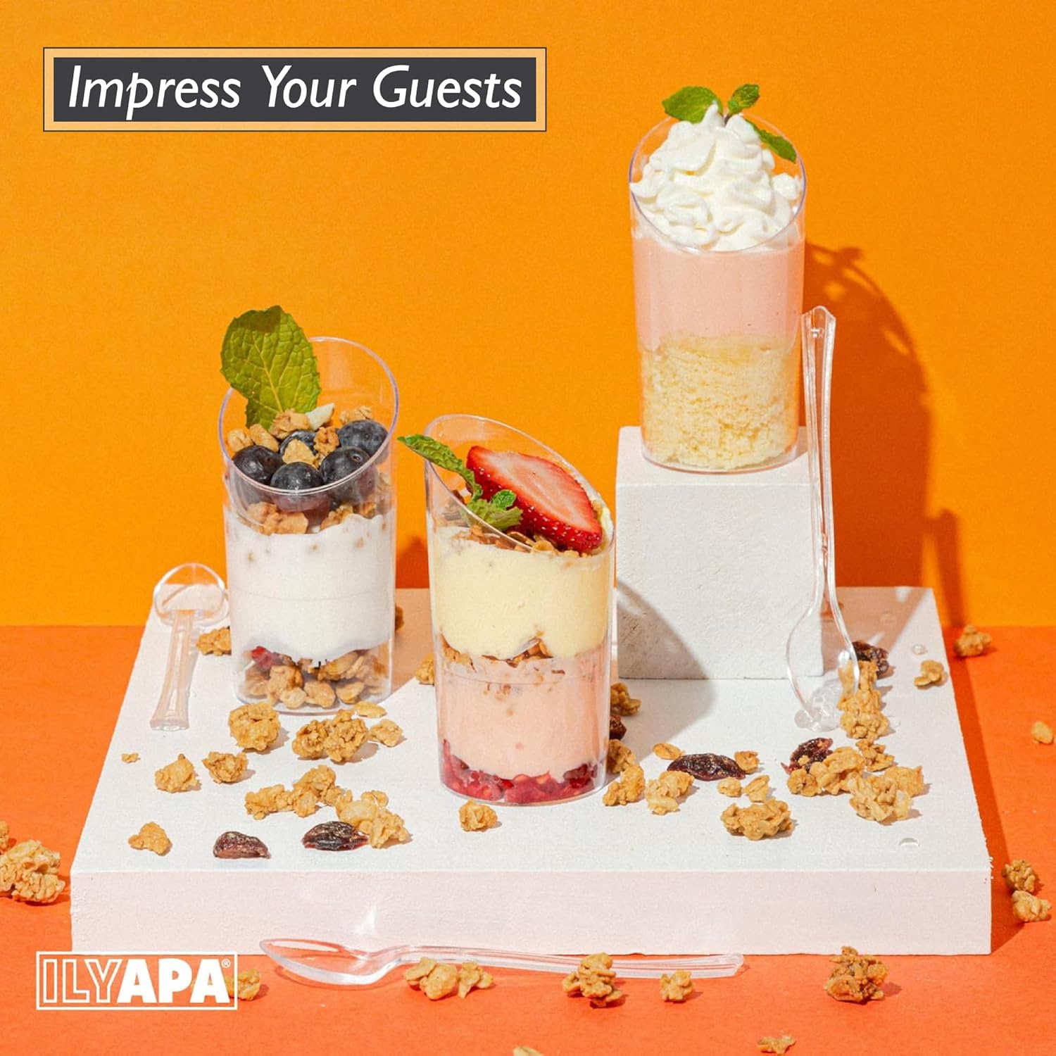Ilyapa 3oz Plastic Dessert Cups - 100 Pack Mini Dessert Cups with Spoons - Clear Reusable Small for Cheesecake Shooters, Chocolate Mousse, Parfait - Party and Catering Supplies - Slanted