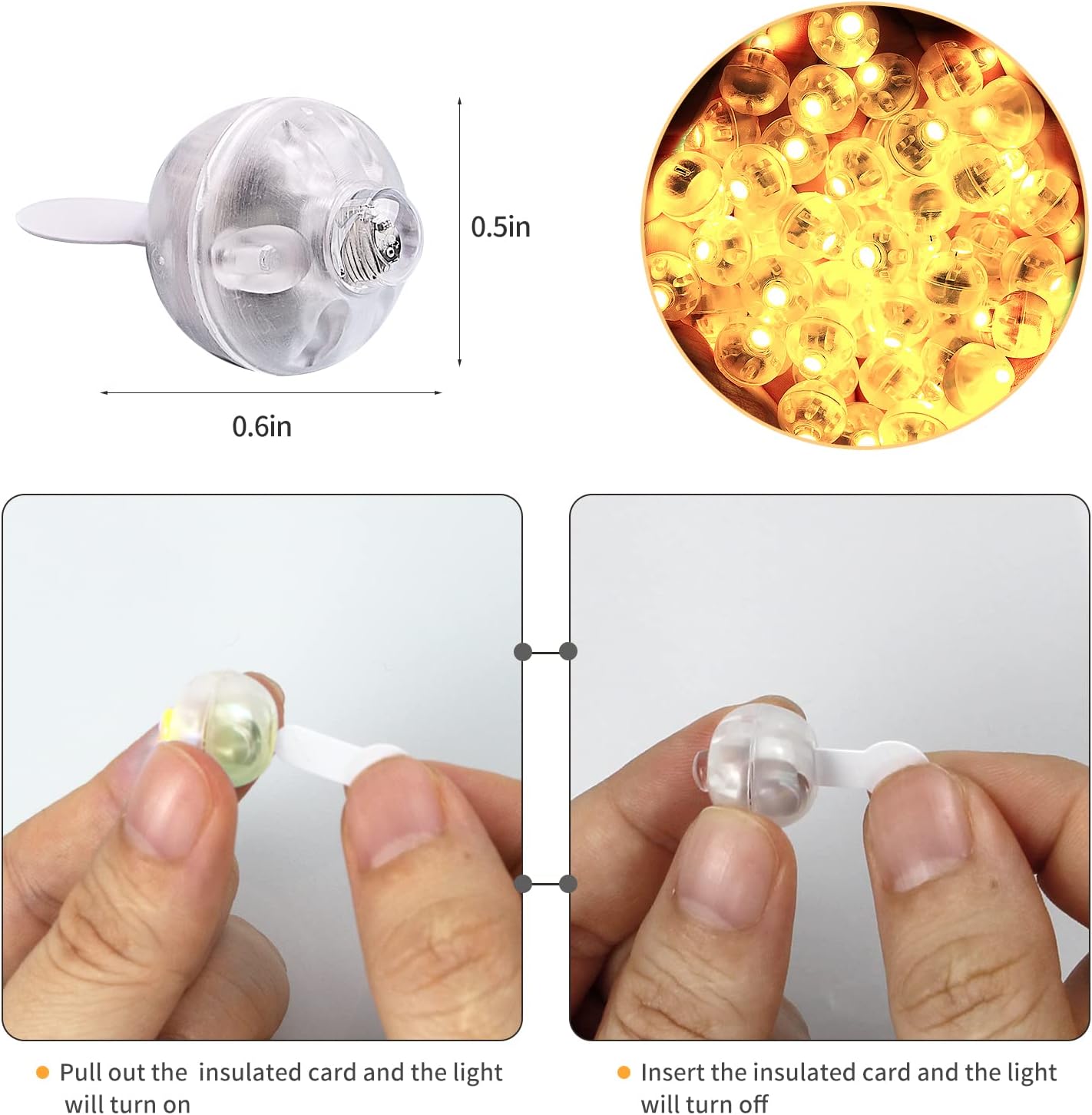 • Reusable Balloon Lights: You can turn off the light by putting the tabs back into the slot to save battery life; If you plan to reuse the lights, save the little tabs that you pull out to activate them; The replacement batteries are LR41