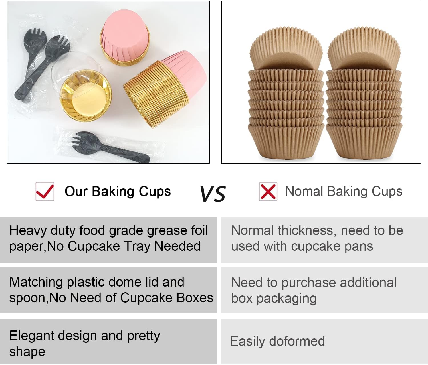 Cupcake Liners for Baking 100Pack,Free-Air 3.5Oz Foil Baking Cups with Dome Lids,Disposable Muffin Tins Muffin Cups for Wedding Birthday Party, with Spoons-Pink in gold