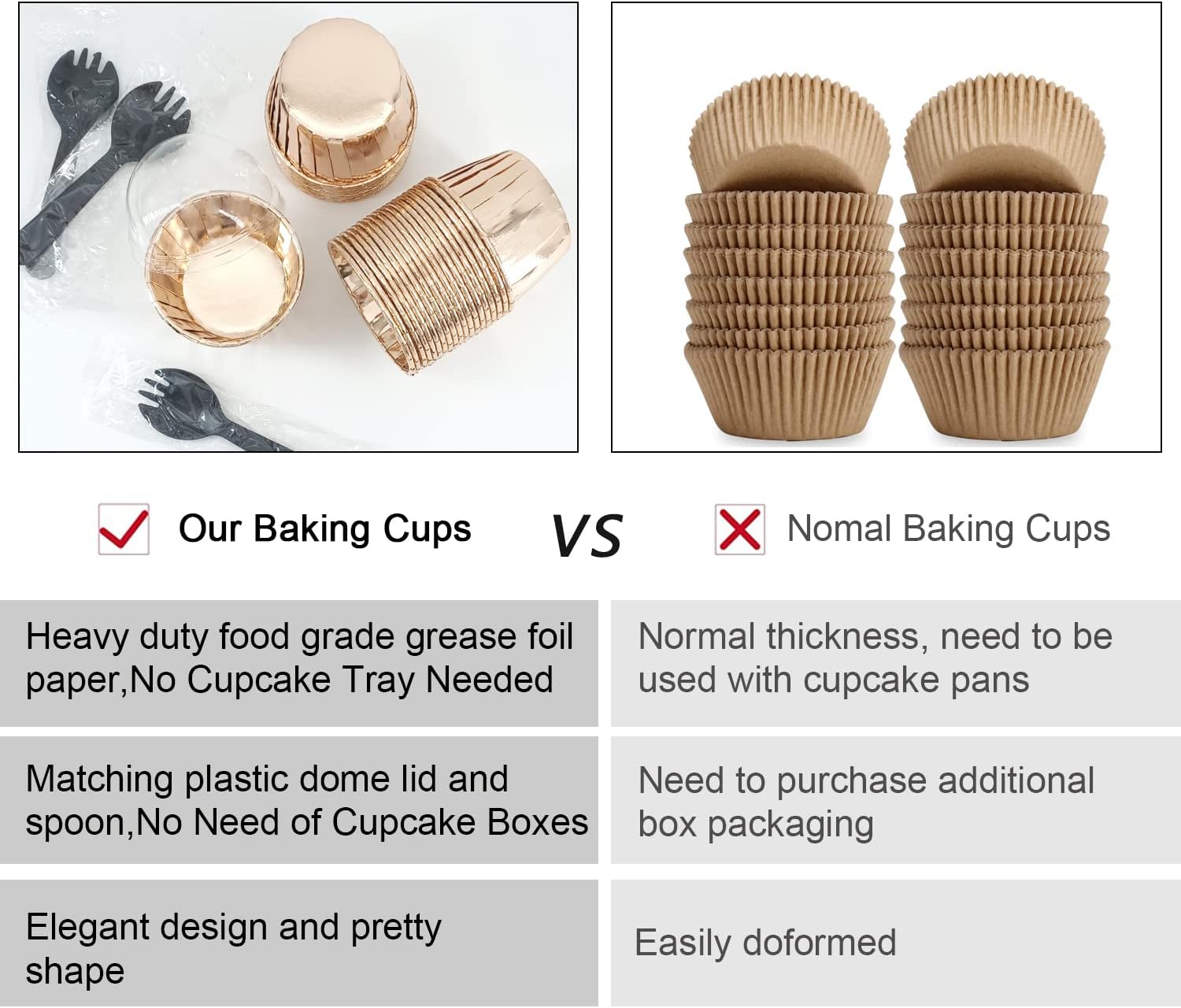 Foil Cupcake Liners with Lids 100Pack,Free-Air 3.5Oz Mini Muffin Liners Cupcake Baking Cups,Disposable Muffin Tins Cupcake Wrappers for Wedding Birthday Party, with Spoons-Champagne