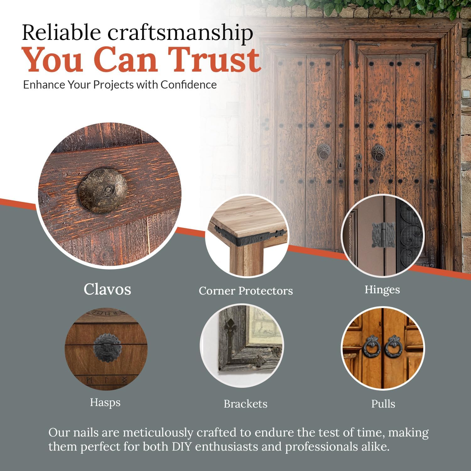 • IDEAL USES: These decorative hardware nails are perfect for a variety of applications, including barn door window shutters, exterior shutters, and faux wood beams. Ideal for upgrading wooden barn doors and farmhouse barn door hardware, they provide both functional and aesthetic enhancements to rustic and traditional projects.