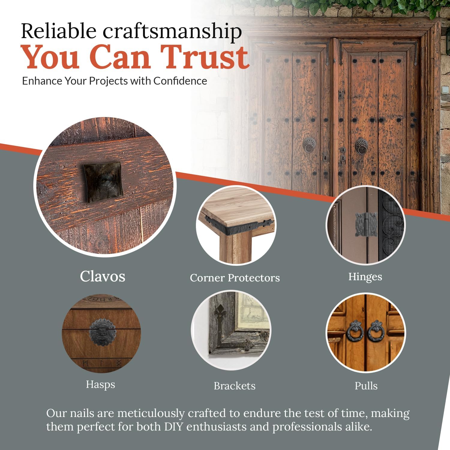 • IDEAL USES: These decorative hardware nails are perfect for a variety of applications, including barn door window shutters, exterior shutters, and faux wood beams. Ideal for upgrading wooden barn doors and farmhouse barn door hardware, they provide both functional and aesthetic enhancements to rustic and traditional projects.