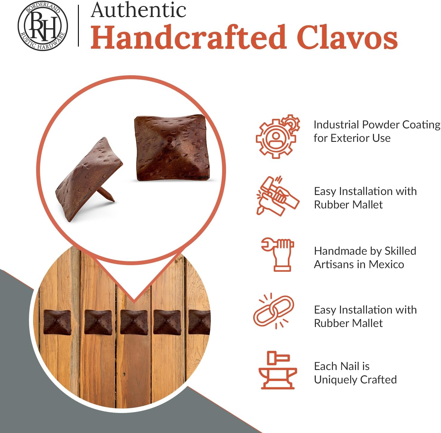 10 Pack 1.5" Square Head Iron Clavos Decorative Nails – Sealed Rusted – Handmade Rustic Square Fasteners for Farmhouse Shutters, Faux Wood, Barn Doors, Shutters, and Gates – Ornamental Wood Accent