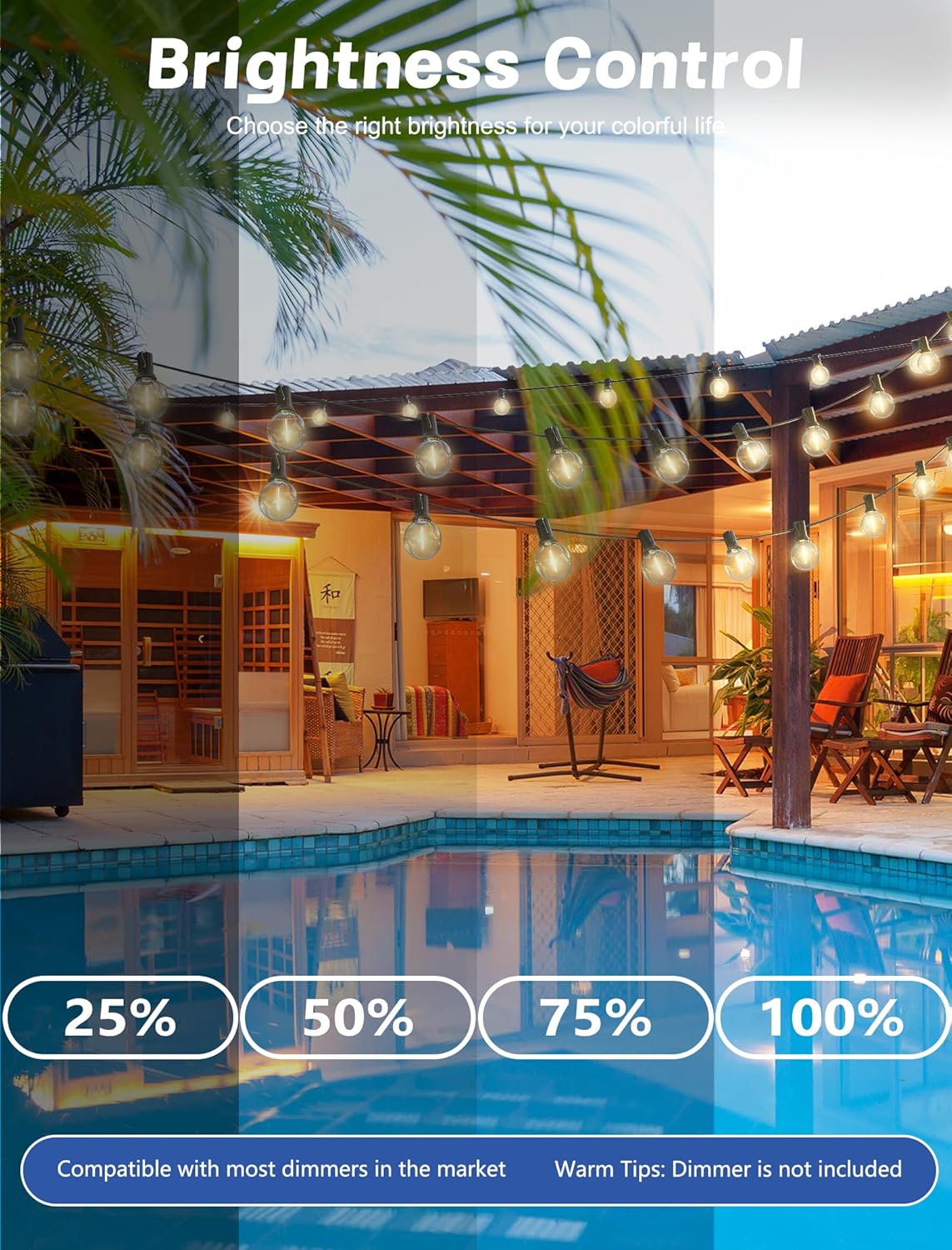 • Easy to Install: 100Ft globe led string lights, Outdoor hanging string lights come with 50 G40 led globe bulbs and 2 spare bulbs. The patio string light is easy to install that each light socket has a clip to fix or place the light string to anywhere as your need