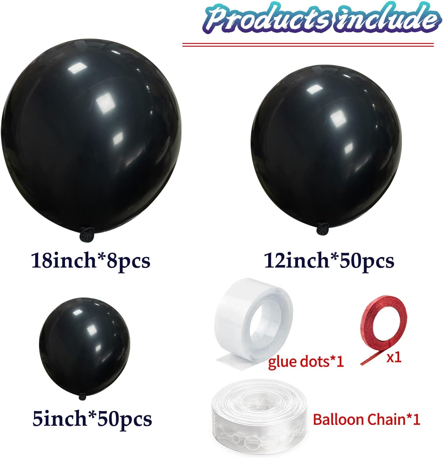 • Black balloon garland kit: 111Pcs Black balloons pack, including 8 pcs 18 inch balloons, 50 pcs 12 inch balloons, 50 pcs 5 inch balloons, a 5 meter balloon chain, 100 dots of glue dots, a roll of ribbon.