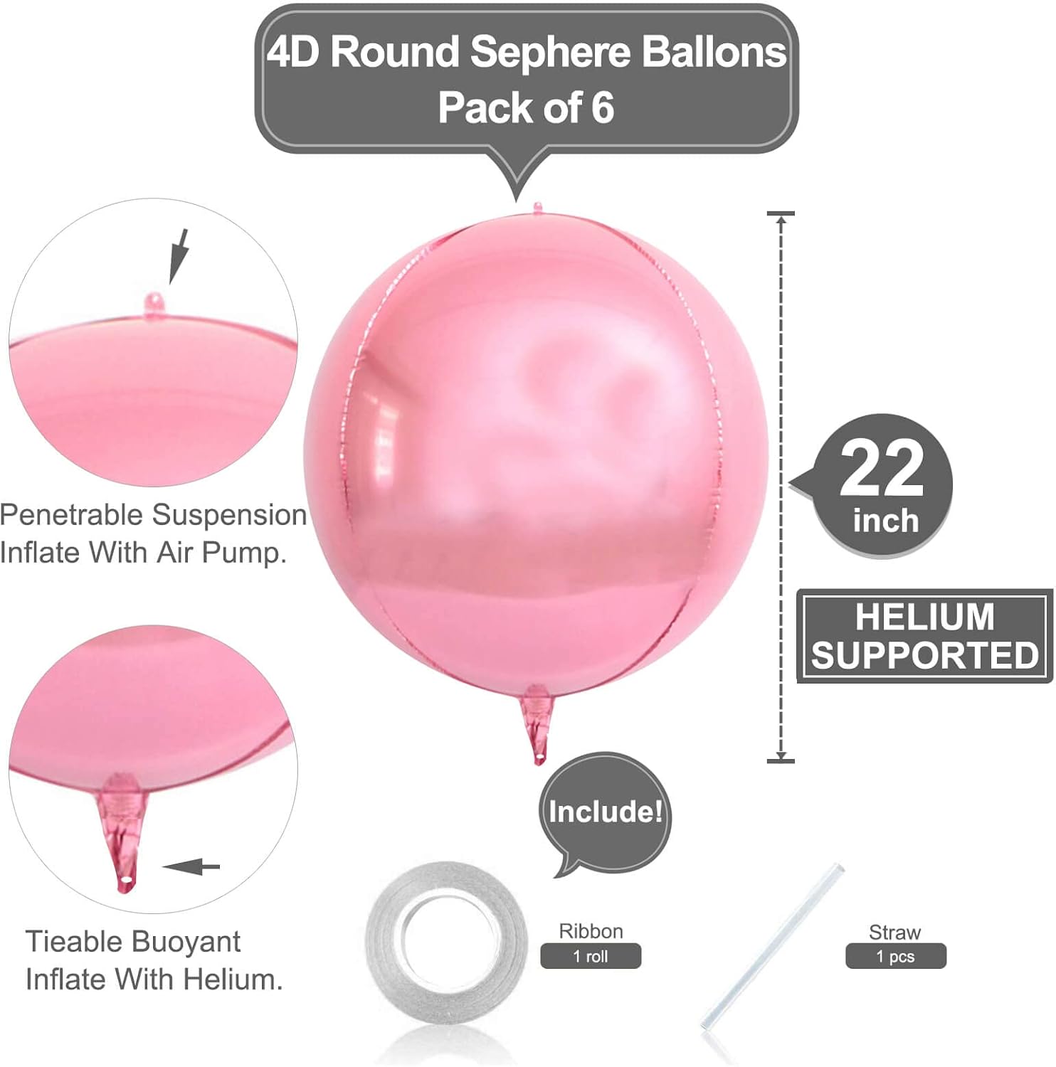 6 Pack Pearl Pink 22 Inch 4D Foil Balloons Big 360 Degree Round Sephere Mylar Balloons Mirror Finish Metallic Balloons for Wedding,Birthday,Bachelorette,Baby Shower Decorations Party Supplies