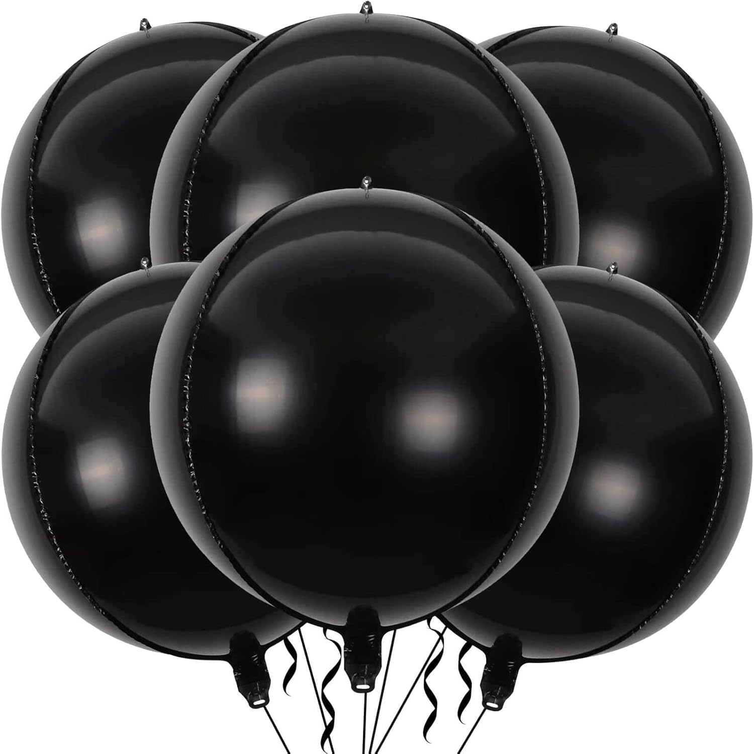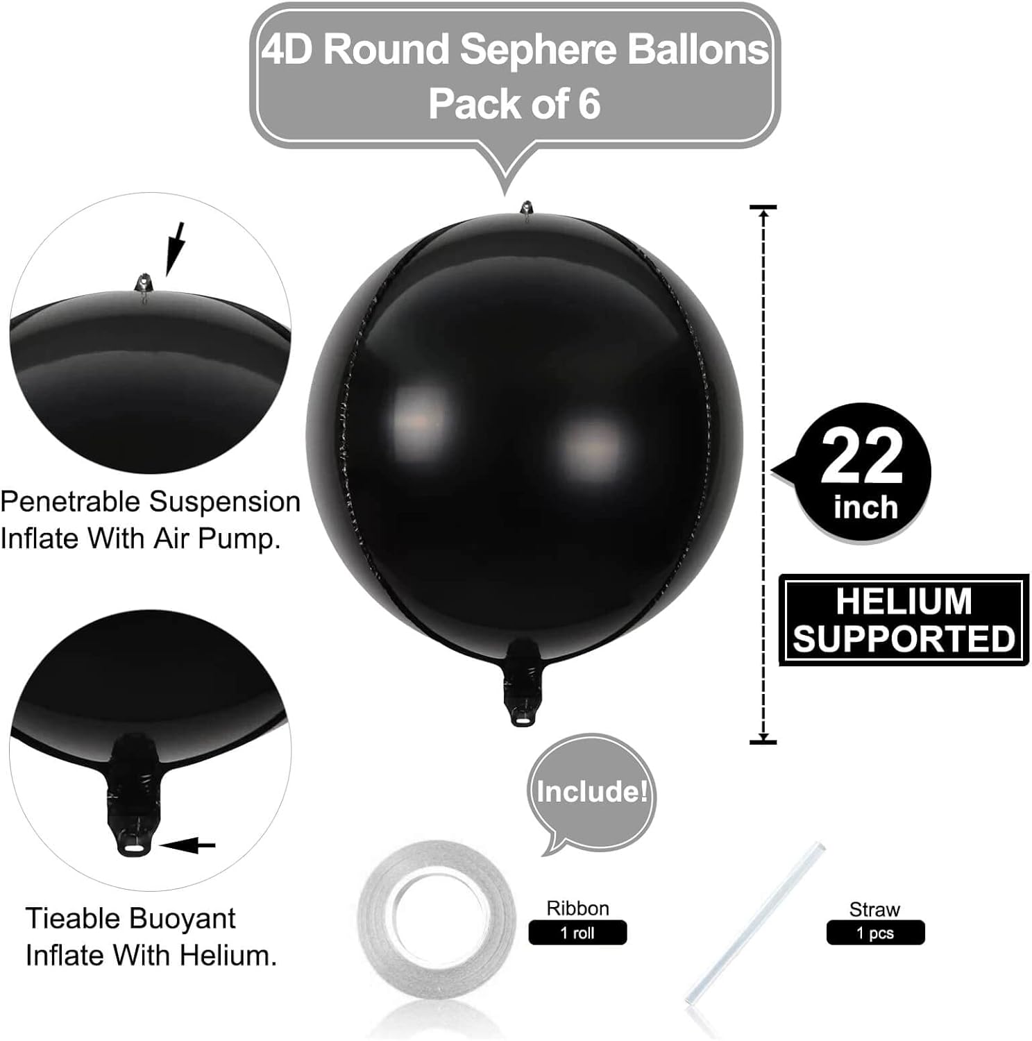 6 Pack Black 22 Inch 4D Foil Balloons Big 360 Degree Round Sephere Mylar Balloons Mirror Finish Metallic Balloons for Wedding,Birthday,Bachelorette,Baby Shower Decorations Party Supplies