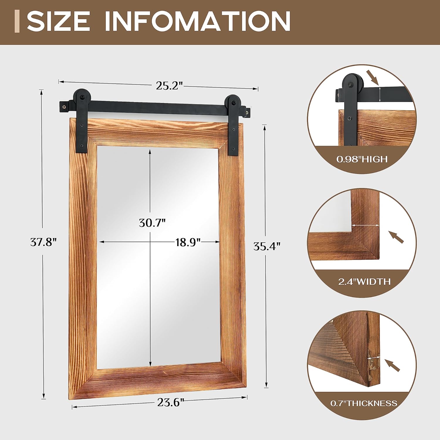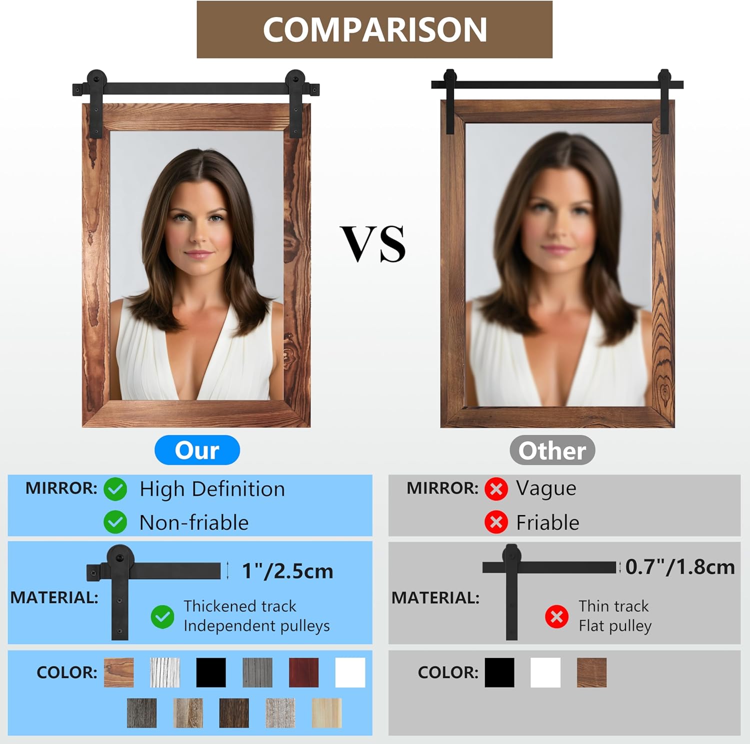 • QUALITY MATERIALS: The frame of the barn door mirror consists of an antique solid wood frame and a sturdy metal bracket. The interior features a 4mm HD silver mirror with clear and distortion-free reflections, providing a better sense of light and projection in your space