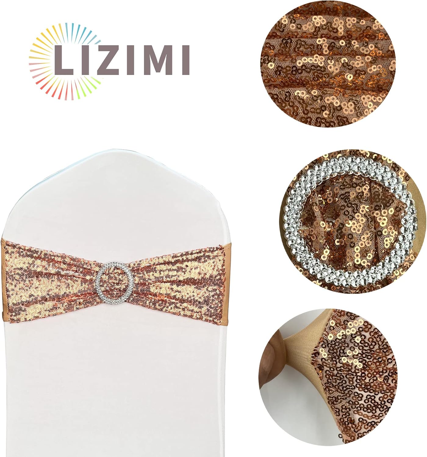 Chair Sashes Sequin Stretch Chair Bands Spandex Polyester Bows for Party Hotel Wedding Banquets Decoration - 6 Pcs Rose Gold