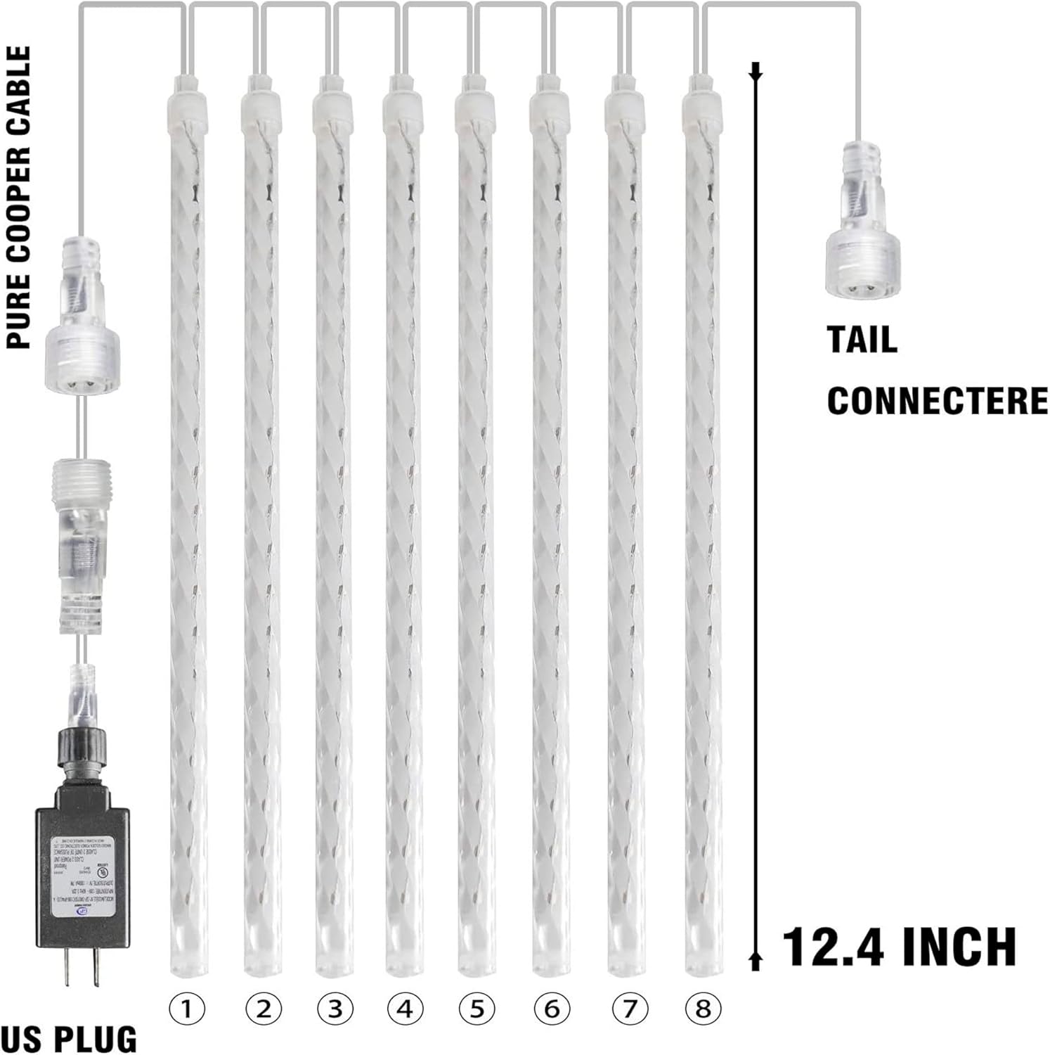 • Dimensions: Each Dazzle Bright Independence Day meteor shower rain light has 8 tubes, each tube is 30 cm / 12 inch long, each tube is independent from other tubes. The string wire between eath tube is 14 inch, each light has 16.4 FT lead wire, allow you to connect the power conveniently