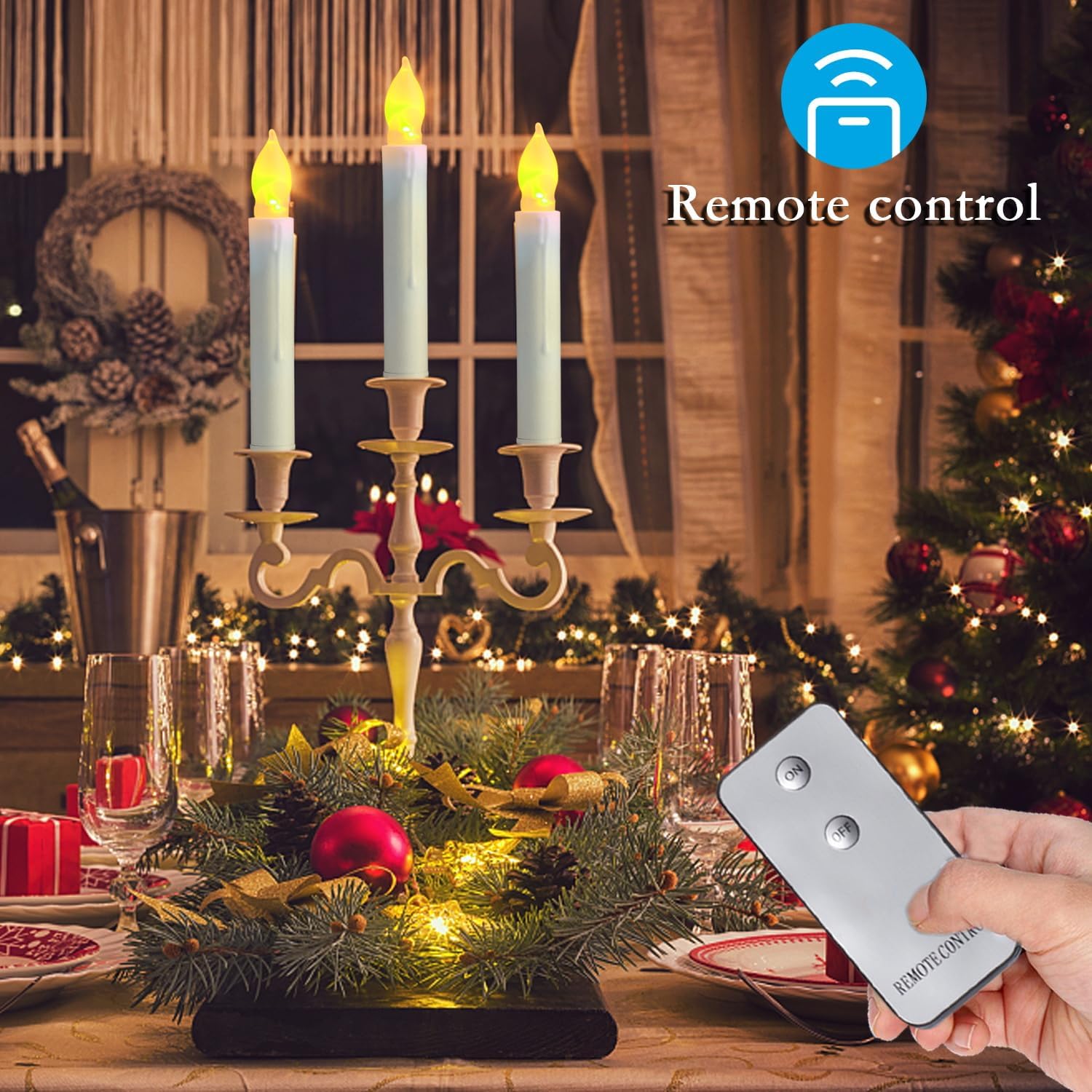 • IDEAL DECORATION -This pack have 12 realistic batteries operated taper candles and one remote. They have warm white flicking flame and dripping wax design. Perfect for Movie themed party, dinner table, church service, birthday, wedding, fireplace, Halloween decorations,Christmas decoration. The surprise is that you can hang candles floating from the ceiling with fishing lines(Not included) to create an effect of “floating candles”