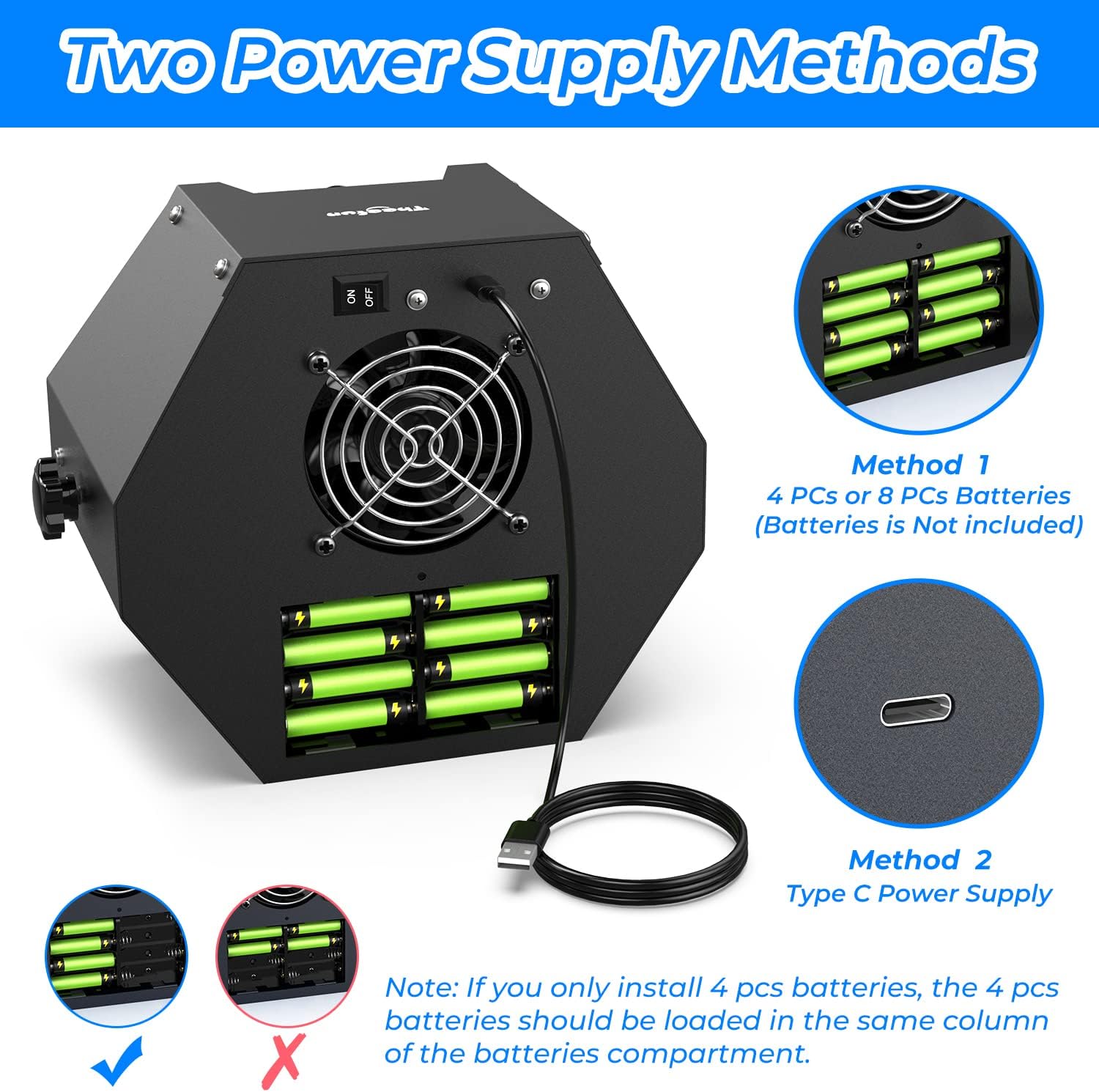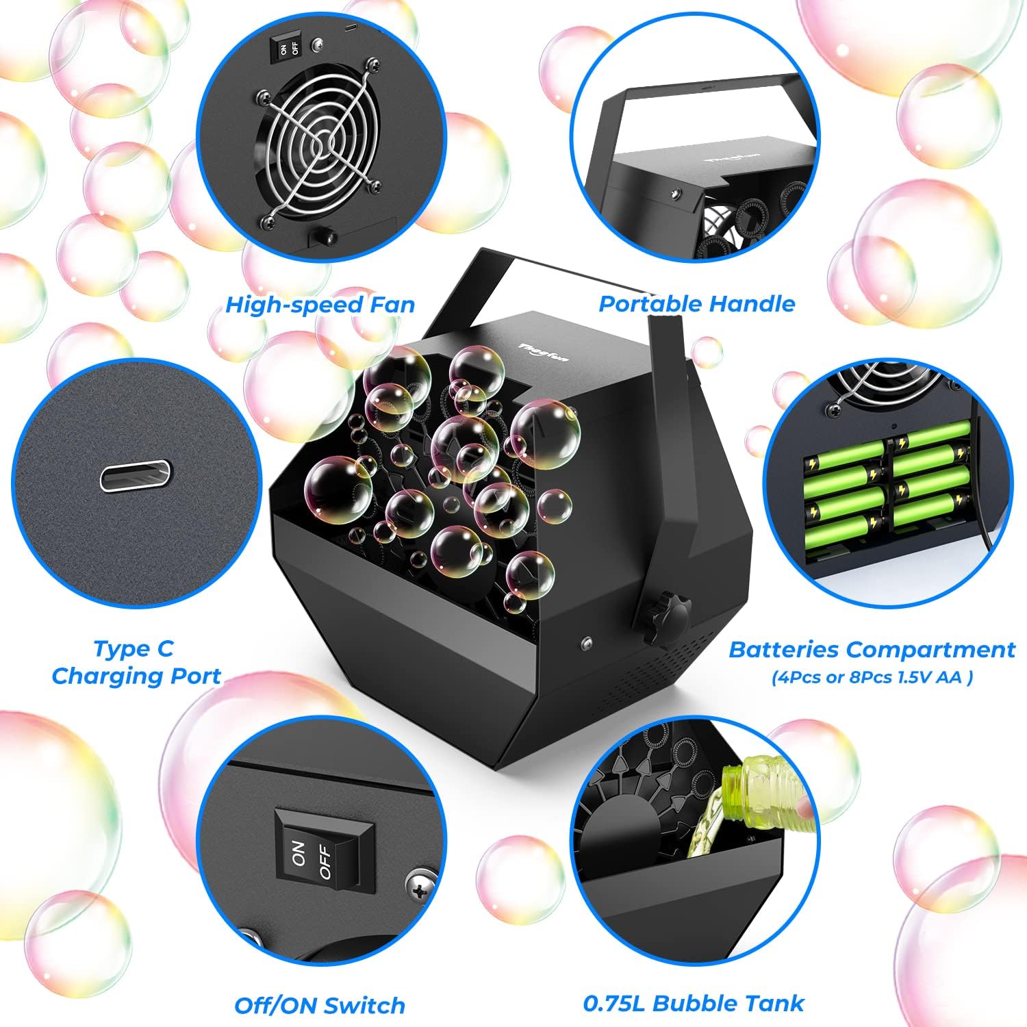 • Two-Ways Powered: The bubble blower can be powered by 4 or 8 Batteries (Not Included) or a Plug-in with the included type C USB cable, providing maximum convenience for you and letting you enjoy the bubble machine indoors and outdoors.For a good bubble atmosphere experience, we recommend using 8 batteries or plugging USB into a power source.