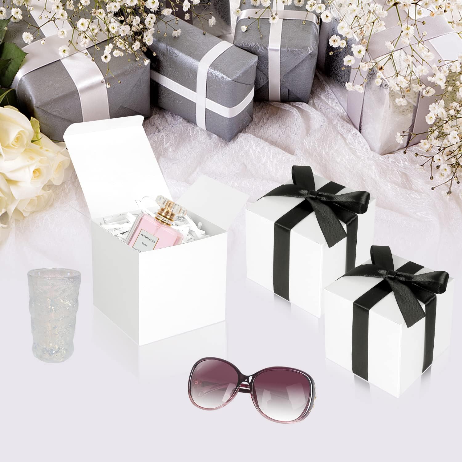 • Size Information: Wedding favor boxes size is 5x5x5 inch Inches, It is already equipped with ribbon and blank tag to complete the outside classy gift looks. White favor boxes are applicable to store candies, chocolates, cookies, cupcake, mugs, shot glasses, candles, bath bombs, soaps, perfumes, makeup, jewelry, or other small gift.
