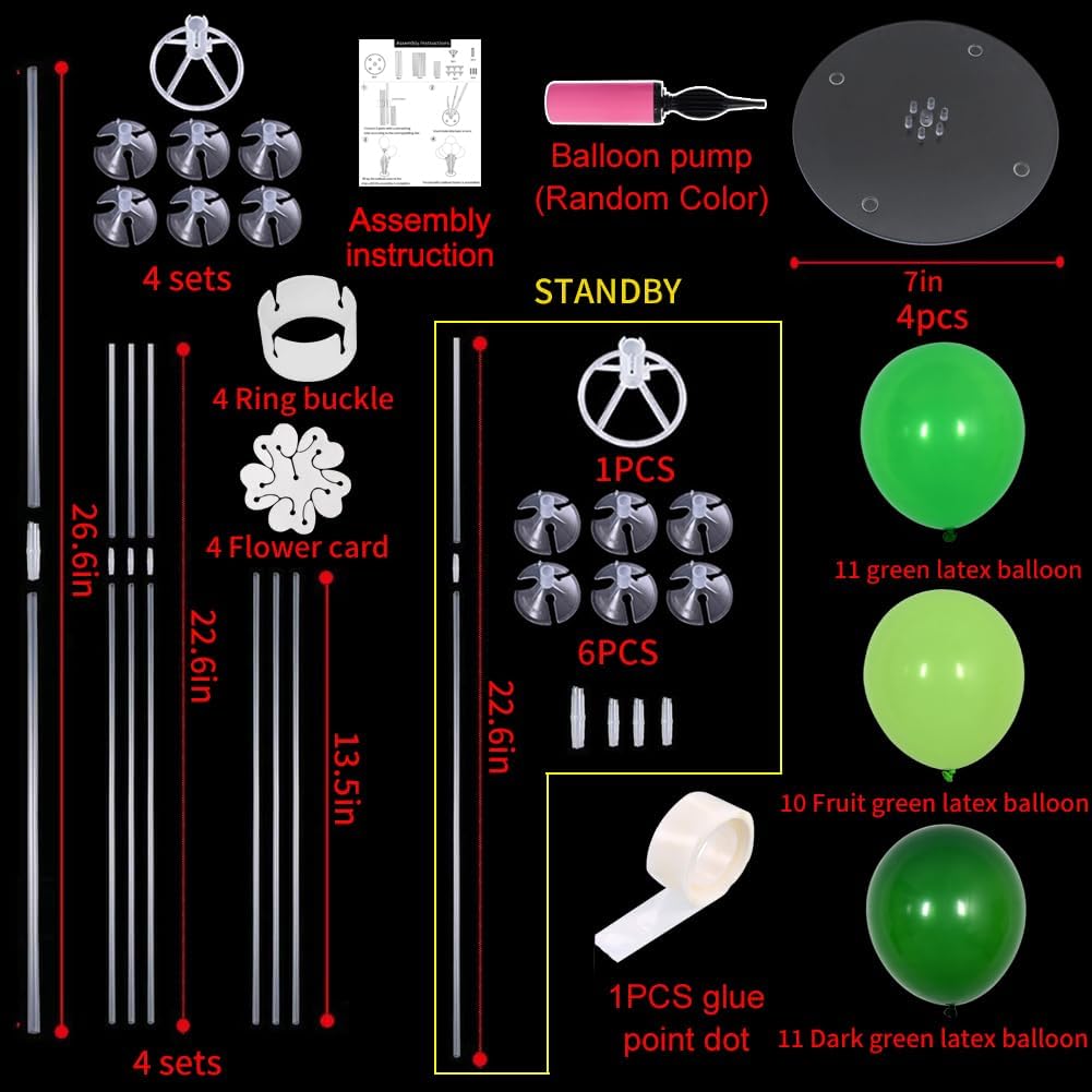 • Package Includes: The balloon stand kit includes 4 reusable balloon centerpiece table decorations and 12 inch 32 pcs Latex Balloons (11 green balloons,10 light green balloons,11 black green balloons),glue point dots,balloon pump,balloon clips,and tie tool.You don’t need to waste money to buy balloons