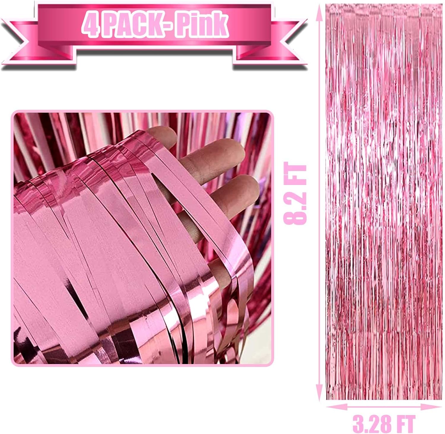 4 Pack Pink Foil Fringe Curtain Backdrop, 3.28Ft x 8.2Ft Metallic Tinsel Foil Fringe Streamer Curtains for Photo Booth Props, Birthday, Wedding, Valentine's Day Decoration Party Supplies