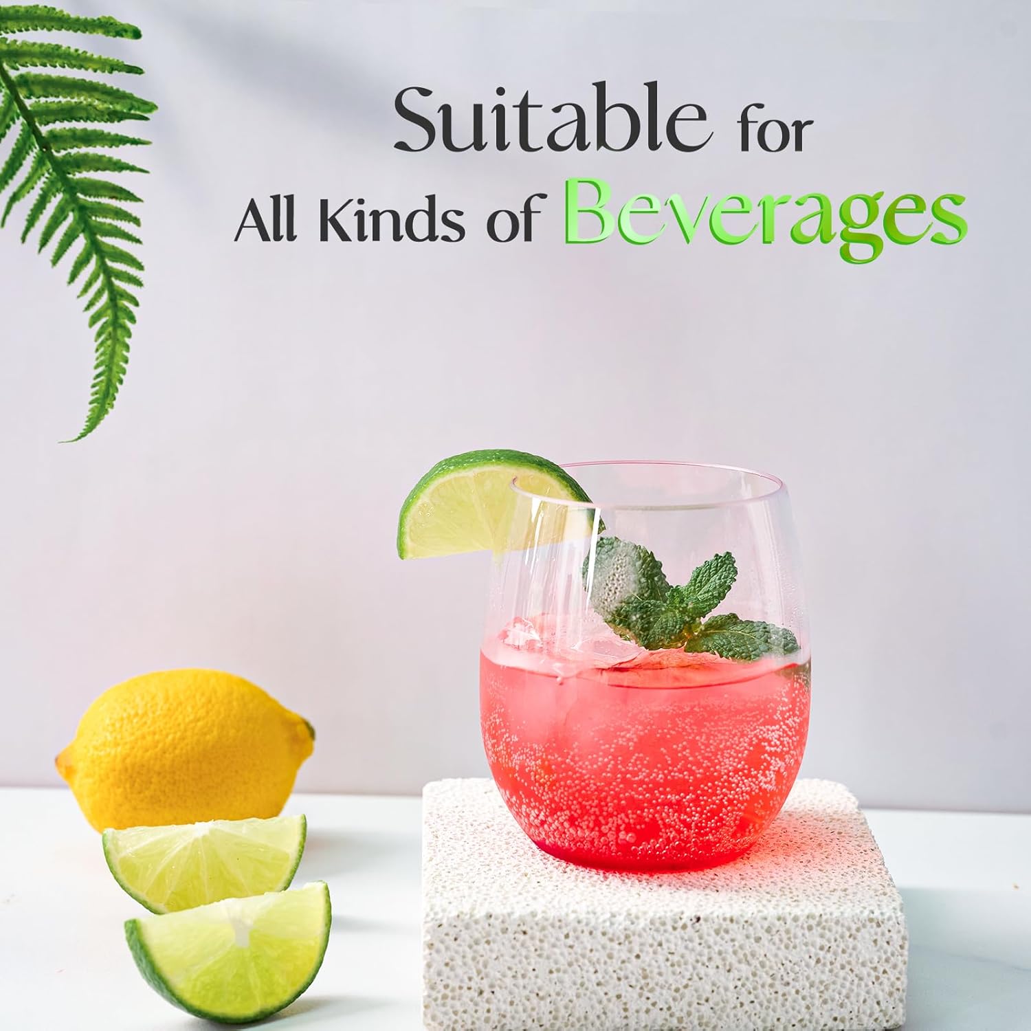 • Our clear stemless plastic wine glasses are heavy duty, unbreakable, shatterproof, disposable and reusable; High quality PET plastic makes the wine glass look crystal clear and adds a touch of ambiance to your party