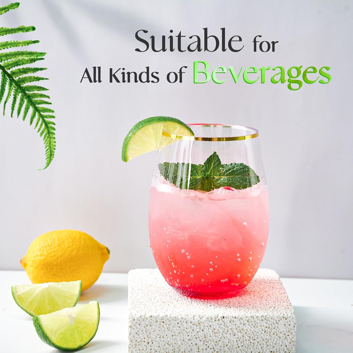 • The package includes 20 packs of 16 oz stemless gold rim plastic wine glasses, premium disposable wine glasses to save you time and effort and enjoy your event without having to worry about post party chaos