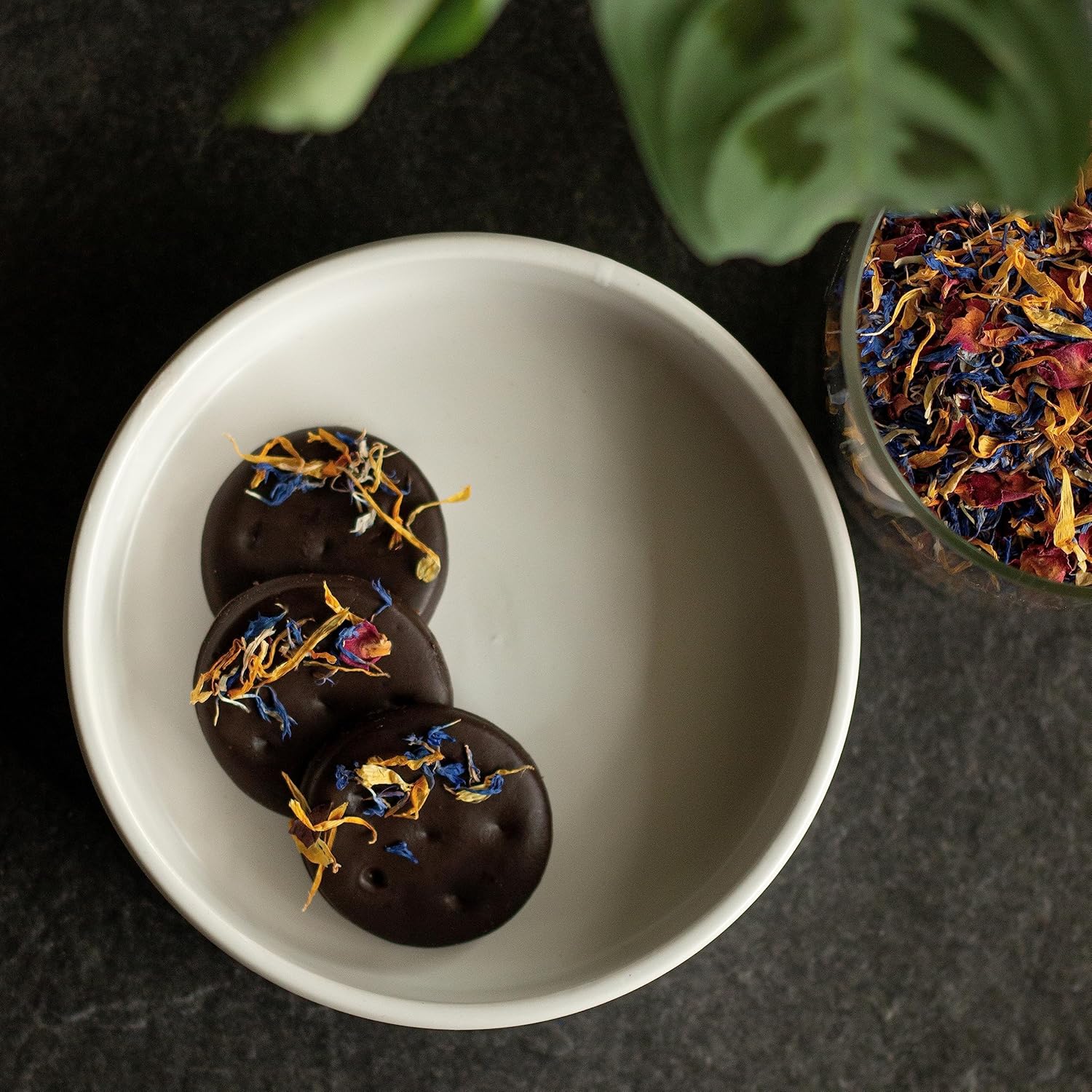 • Vibrant Edible Petal Blend – A premium mix of dried calendula, blue cornflower, and rose petals perfect for decorating cakes, cupcakes, cocktails, and more.