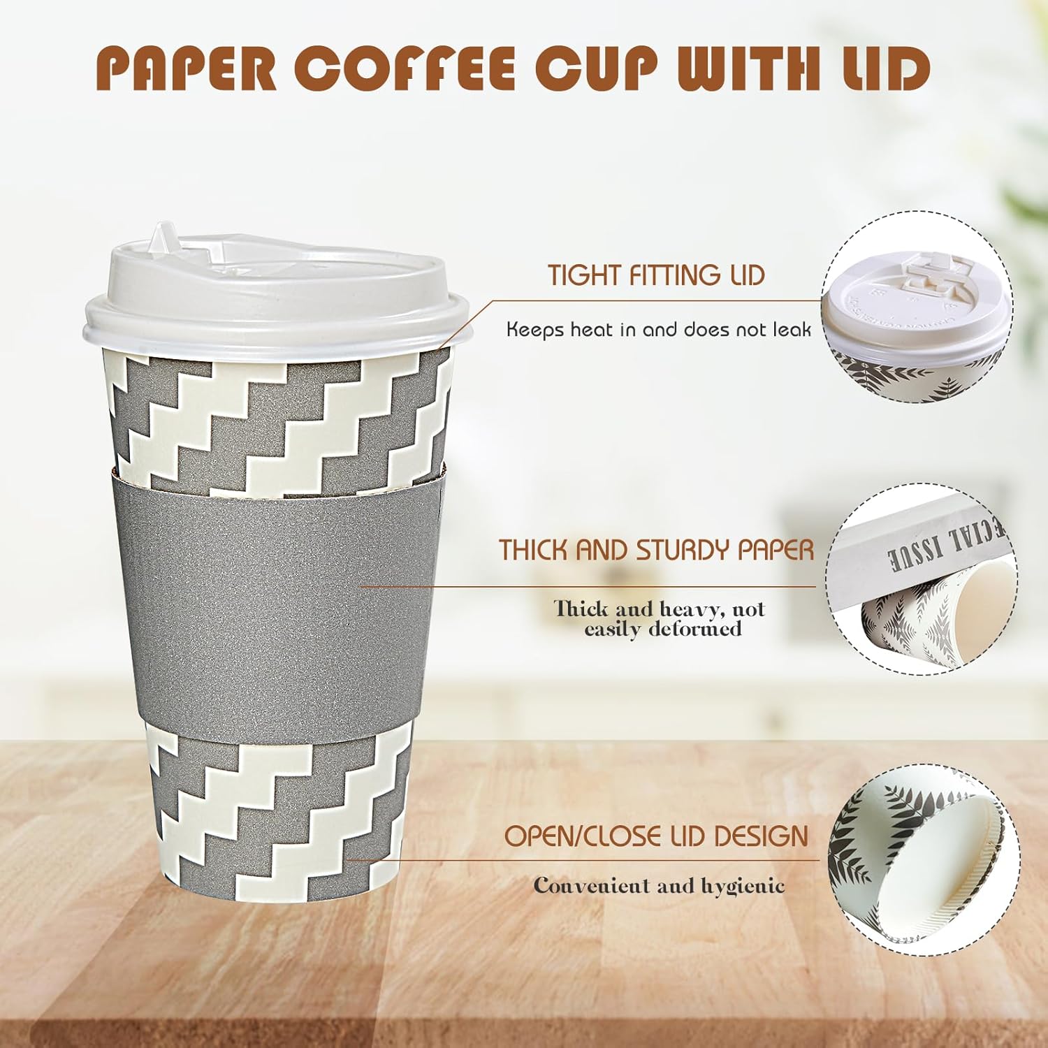 LITOPAK 100 Pack 16 oz Paper Coffee Cups, Disposable Coffee Cups with Lid, Sleeve, and Straws for Home, Stores, and Cafes