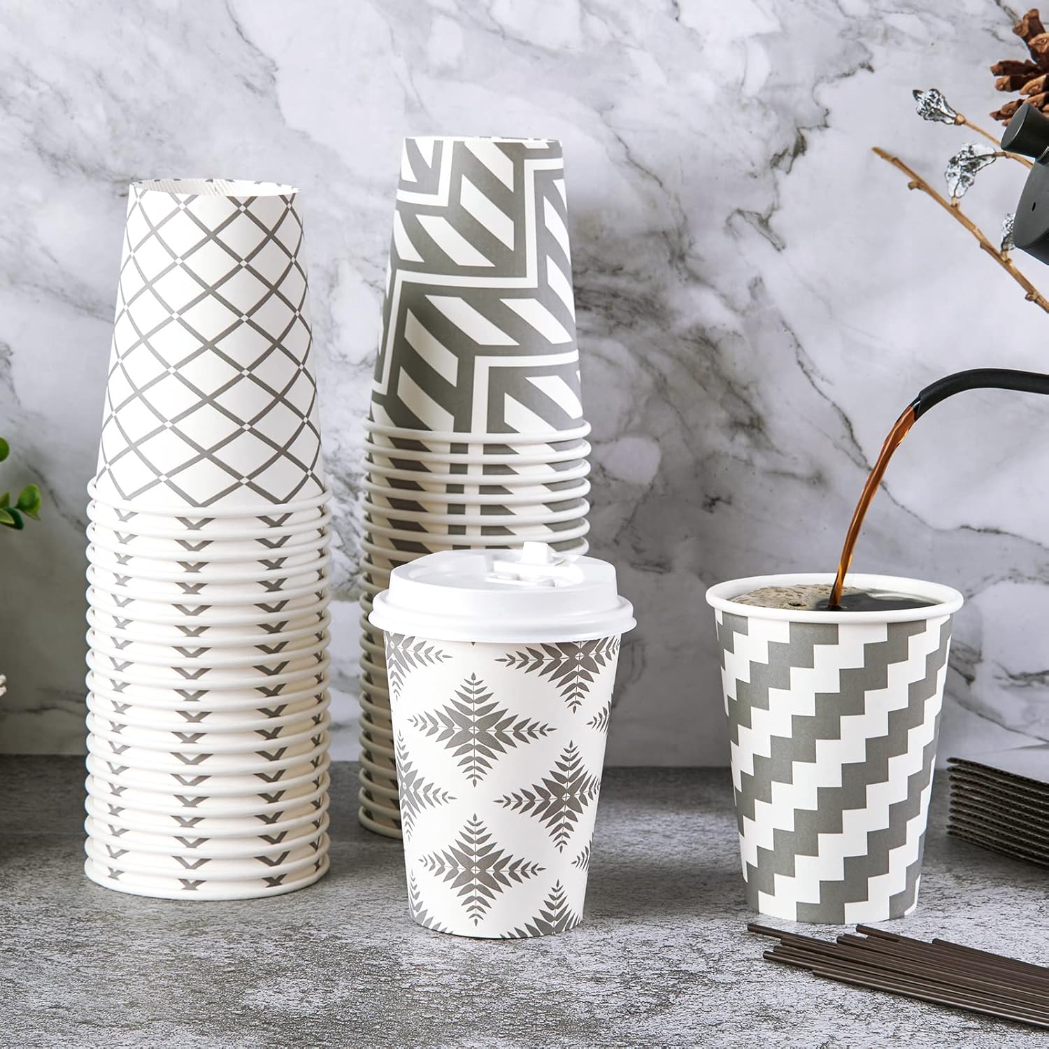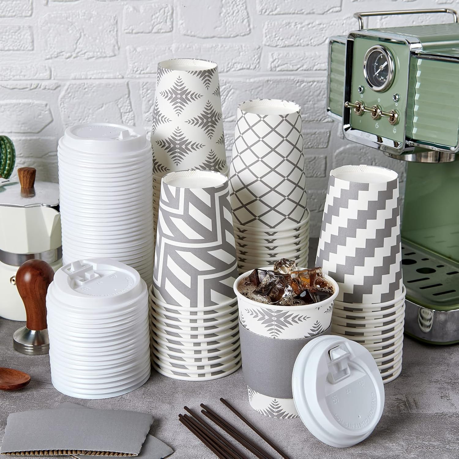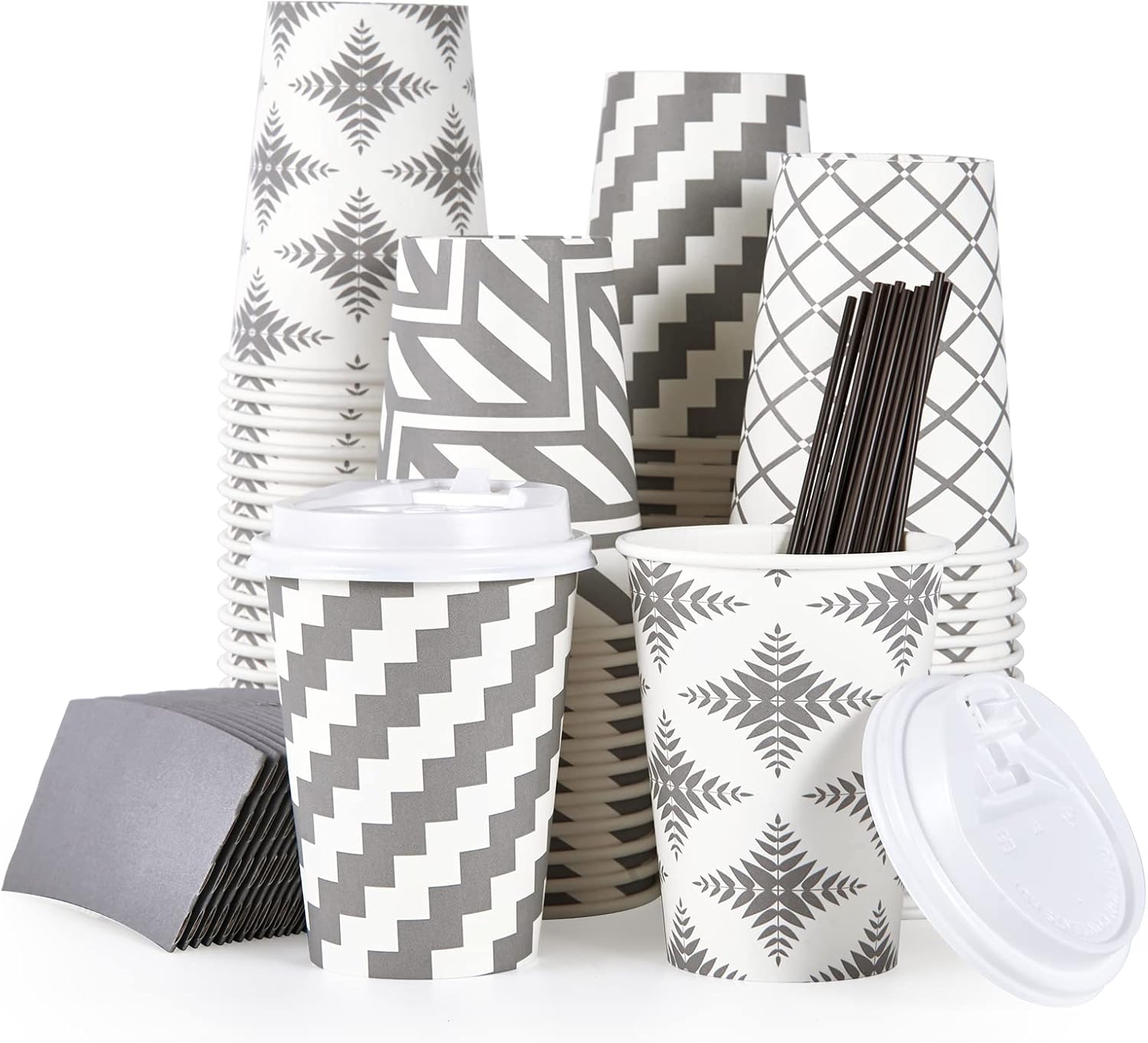 • Great Value Pack: You will receive a pack of 100 12 oz disposable cups, including 100 cups in four grey designs, 100 white lids, 100 grey cup sleeves, and 100 straws