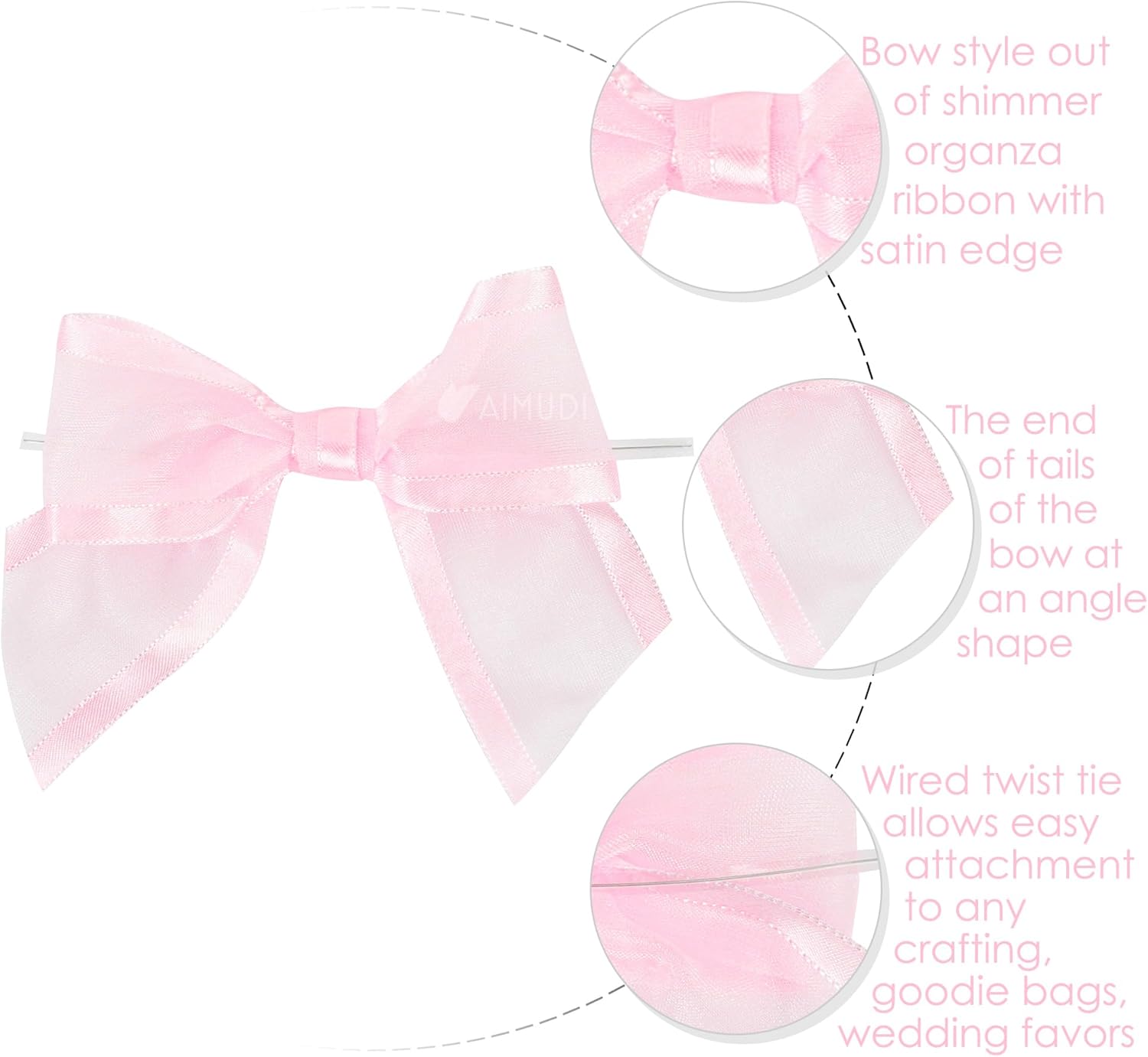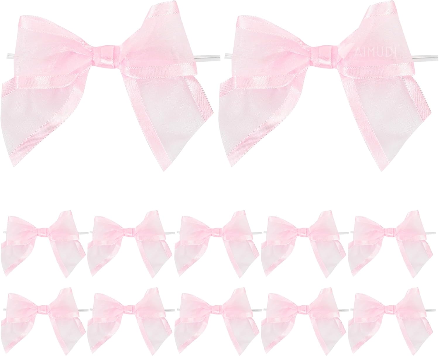 AIMUDI Pink Ribbon Bows 4" Organza Bows Premade Twist Ties Bows for Gift Wrapping Crafts Treat Bags Baskets Cake Pop Baby Shower Birthday Wedding Decor - 12 Counts