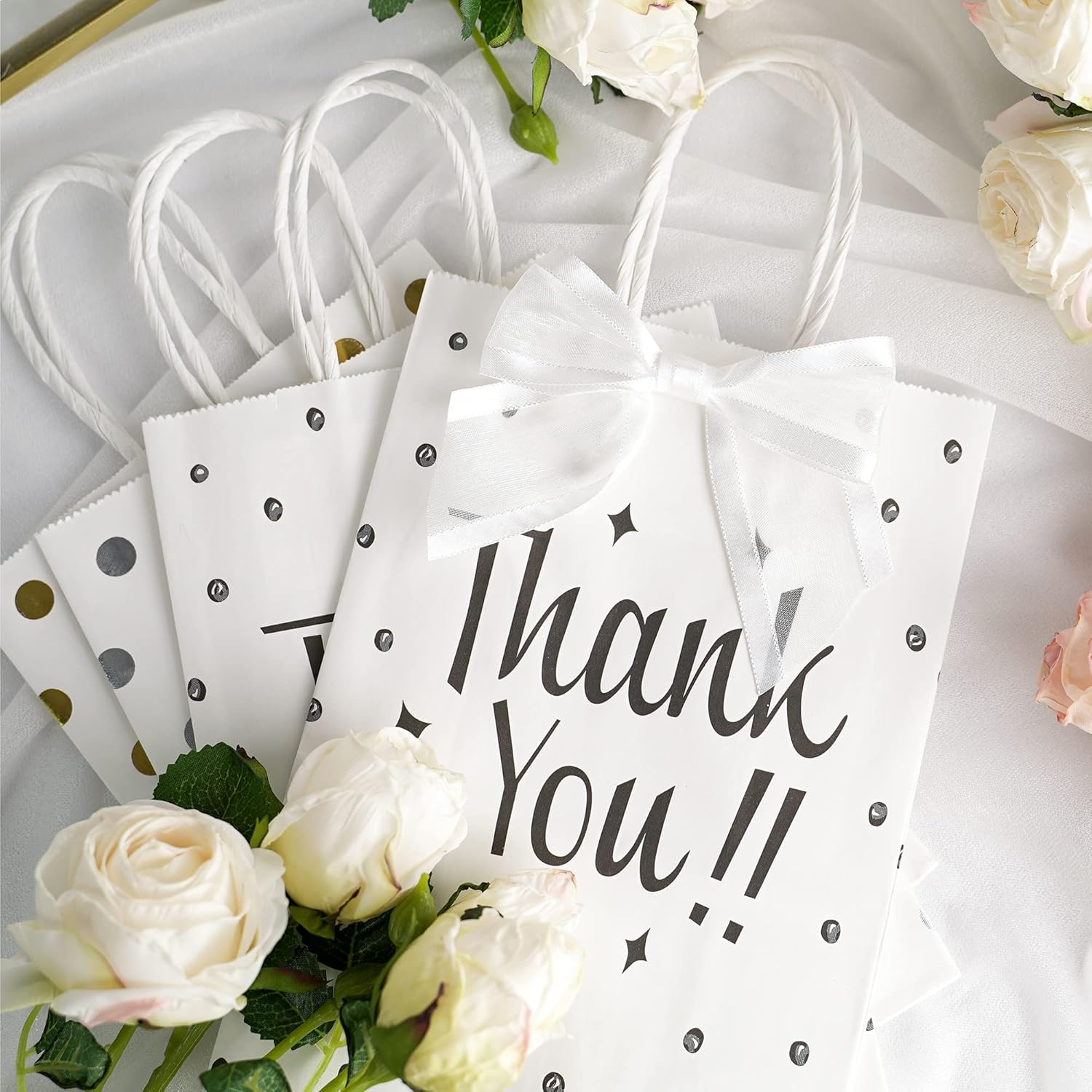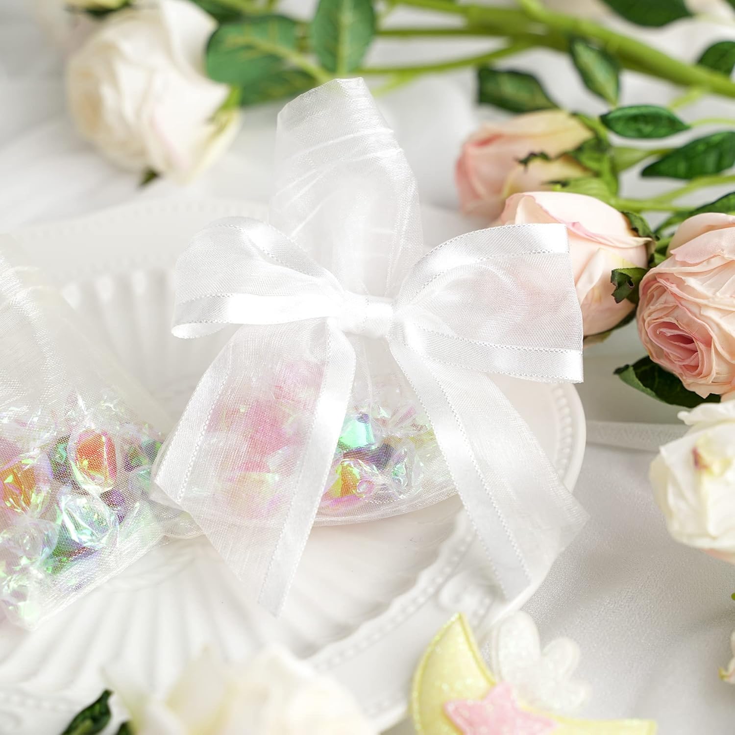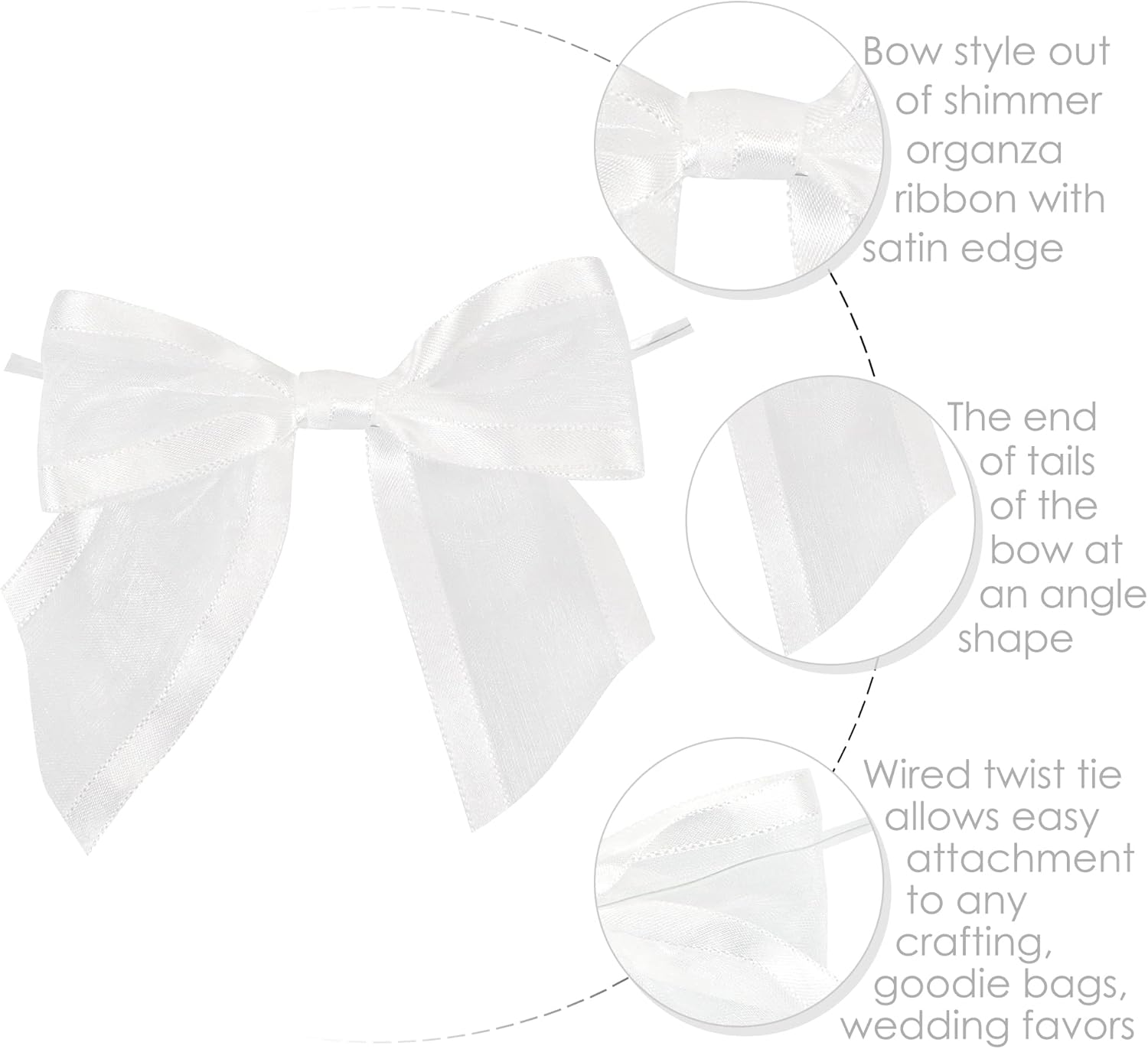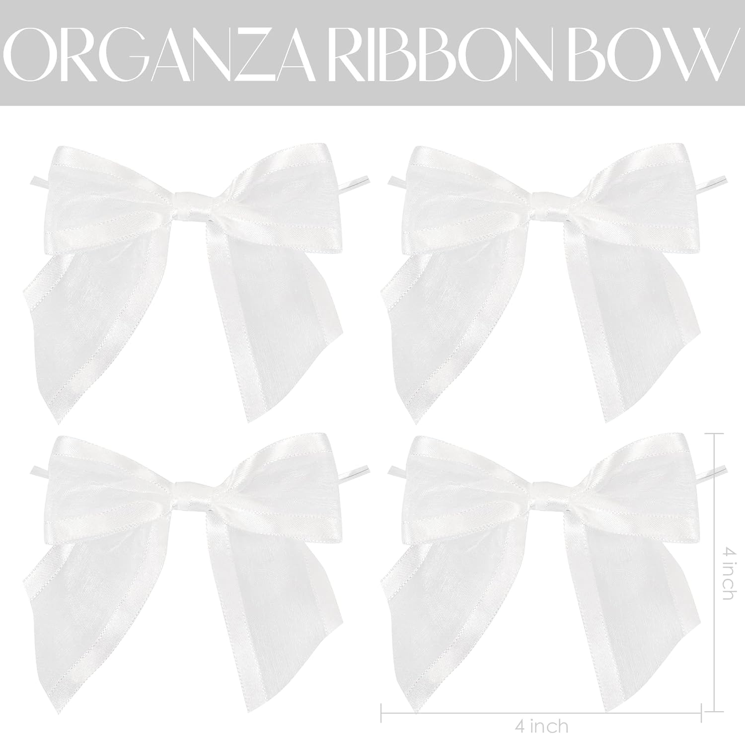 • PRETIED RIBBON BOWS- Decorative bows is made of 1-1/2'' white organza satin edge ribbon with romantic transparency and glossy lustre, easily adding a elegant final touch to your party favor, cake pop bags, gift basket