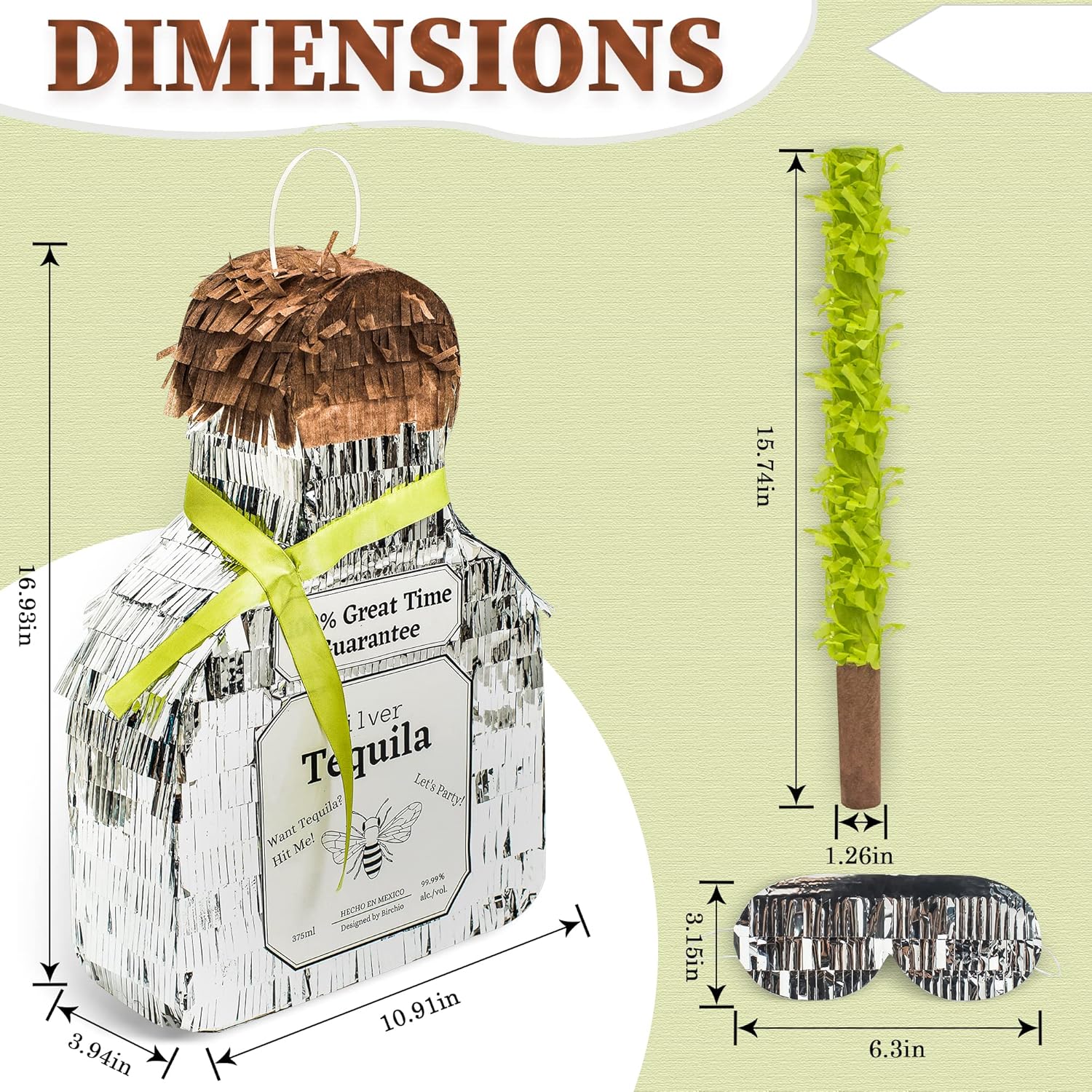 • ❤️【 PREMIUM QUALITY 】- The tequila pinata measures 17 x 10.5 x 4 inches. Made with high and resistant cardboard. Decorated with crepe paper on bond paper, high strength plastic loop to hang. Premium material ensures its durability and fancy looking. It comes with a blindfold and bat to make more fun.