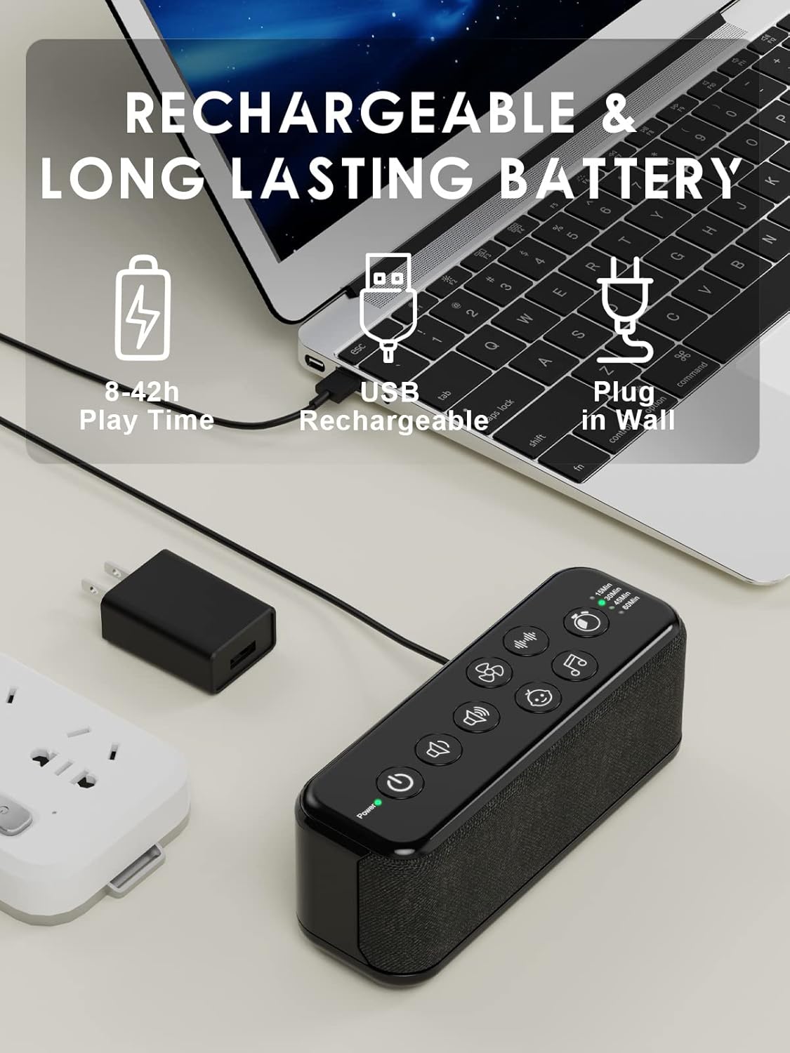 • ๐Ÿ”‹ Rechargeable, Cost-Effective Battery: No more wasting money on AA batteries. This rechargeable sound machine, after fully charged, can last 8-42 hours(depending on the volume grade) of play time. Ideal for uninterrupted sleep or focused work throughout the day