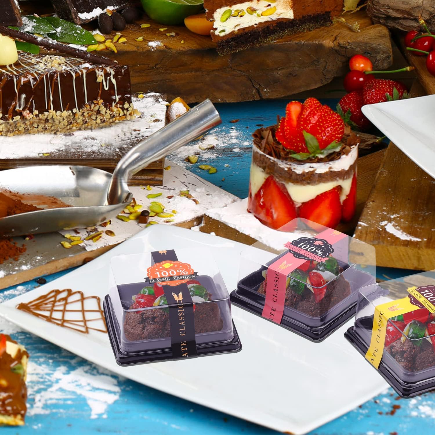 • Disposable, Safe, Durable- The mini cake boxes are made of high quality food grade plastic material, odorless, tasteless and safe to use. The plastic cake box can keep your desserts in clean and fresh condition for a long time