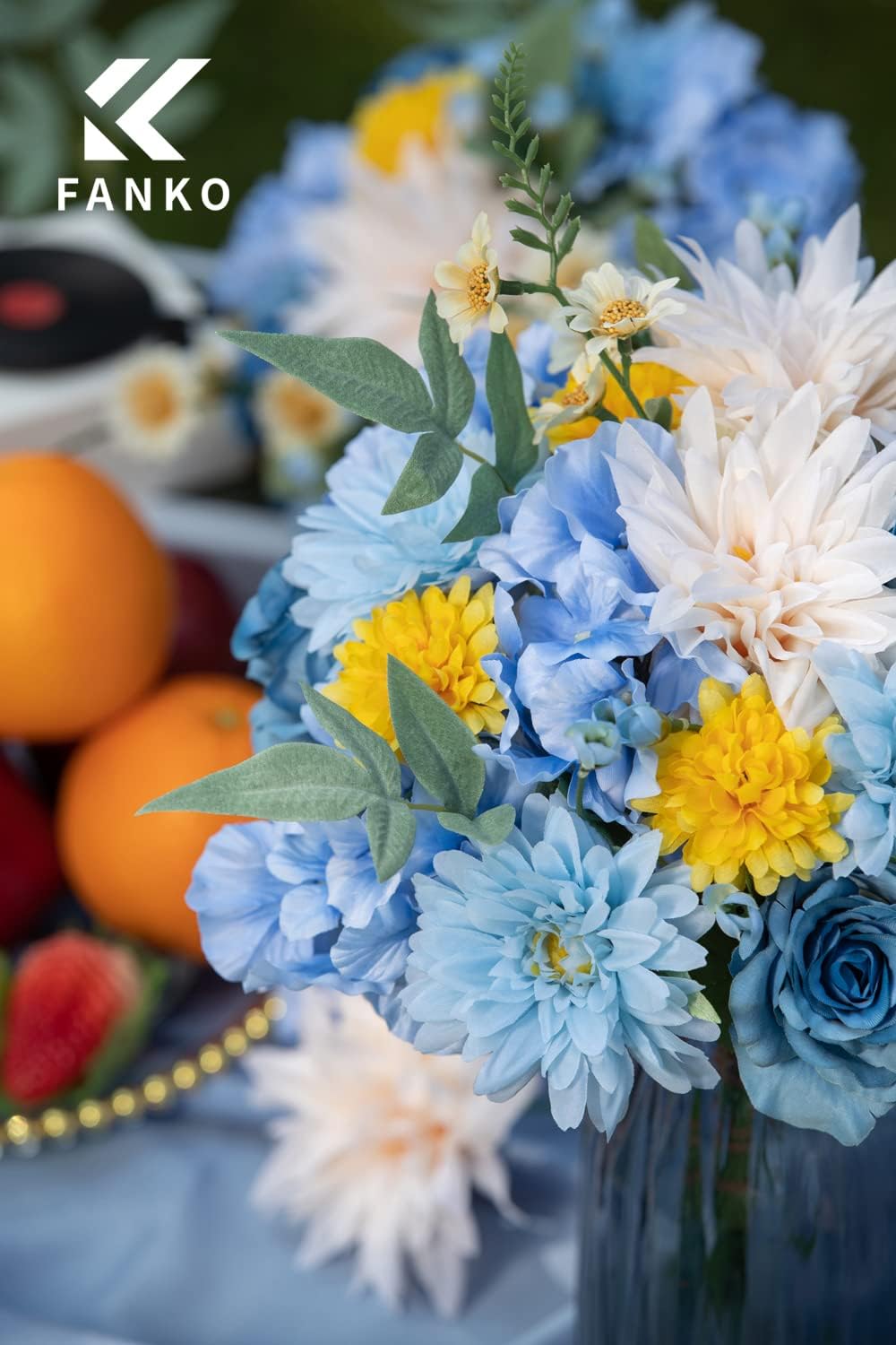 • 【47Pcs in Package】Our artificial flowers combo includes: Cream Semi-Cactus Dahlia x 2 (5.5"), Sky Blue Dahia x 4(4"), Dusty Blue Silk Rose x 5(3.5"), Hydrangea Flowers x 3 (4.5"), Yellow Chrysanthemum Ball x 4(2.5"), Daisy x 12 (1.5"), Rose Buds x 12(0.5"), With Leaf x 3, Nandina Plants x 2. [Notes: Ribbons are not included. Colors may vary slightly due to differences in monitor settings.]
