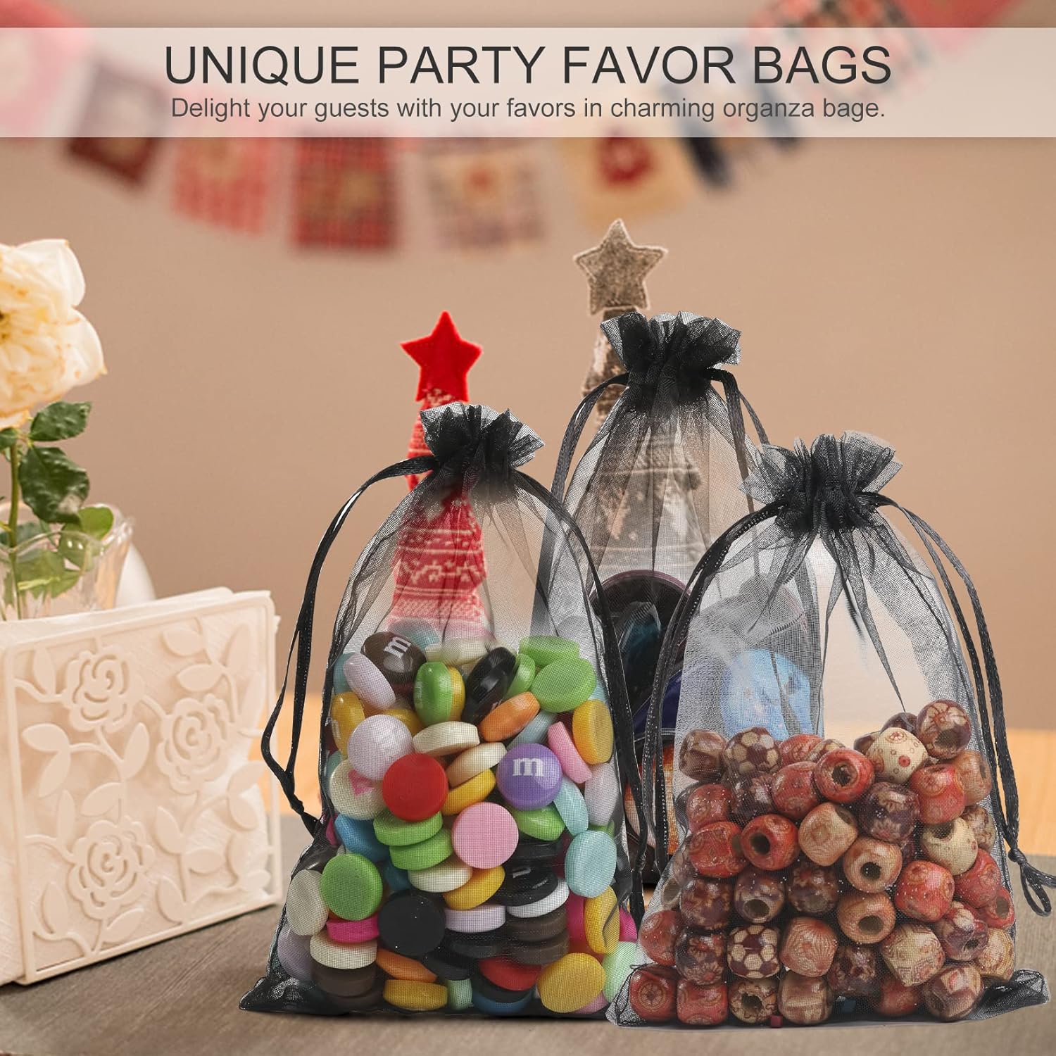ANZNKU 100 Pack Premium Organza Bags, Black Drawstring Wedding Favor, 4x6 Inches Small Mesh for Halloween, Jewelry, Party, Christmas - Sheer Gift
