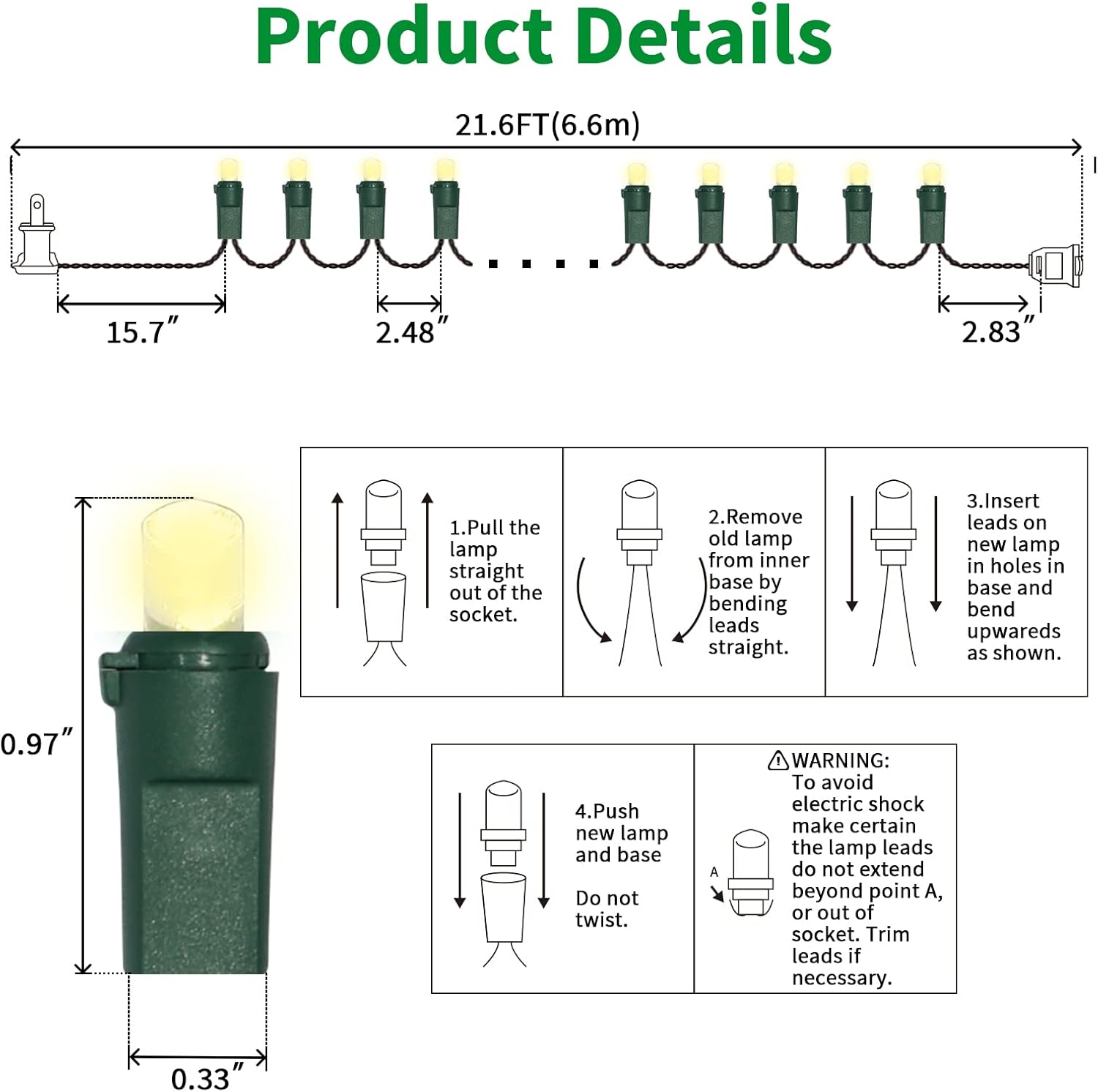• 5mm LED Christmas Lights: 100 counts warm white 5mm wide angle stable LED string lights spaced 6.3 inches apart with green wire. 7.1 inch leads have a stackable male plug and 5.9 inch tails have a female plug for easy end to end connection.