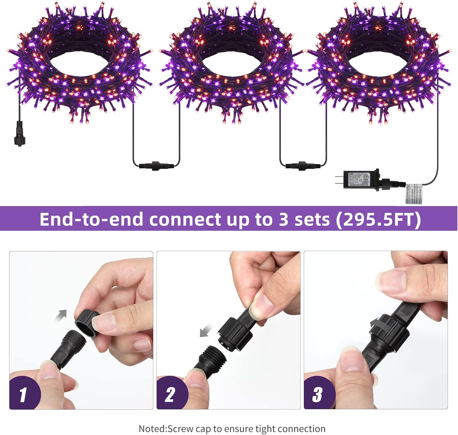 • 98.5ft Halloween Decorations string lights: With 300 Purple & Orange individual LED bulbs. Each black wire lights has end-to-end connection, you can connect up to 3 sets together to illuminate a wider range. Fit different occasions, moods, feelings, holidays, festivals, anniversaries, etc.