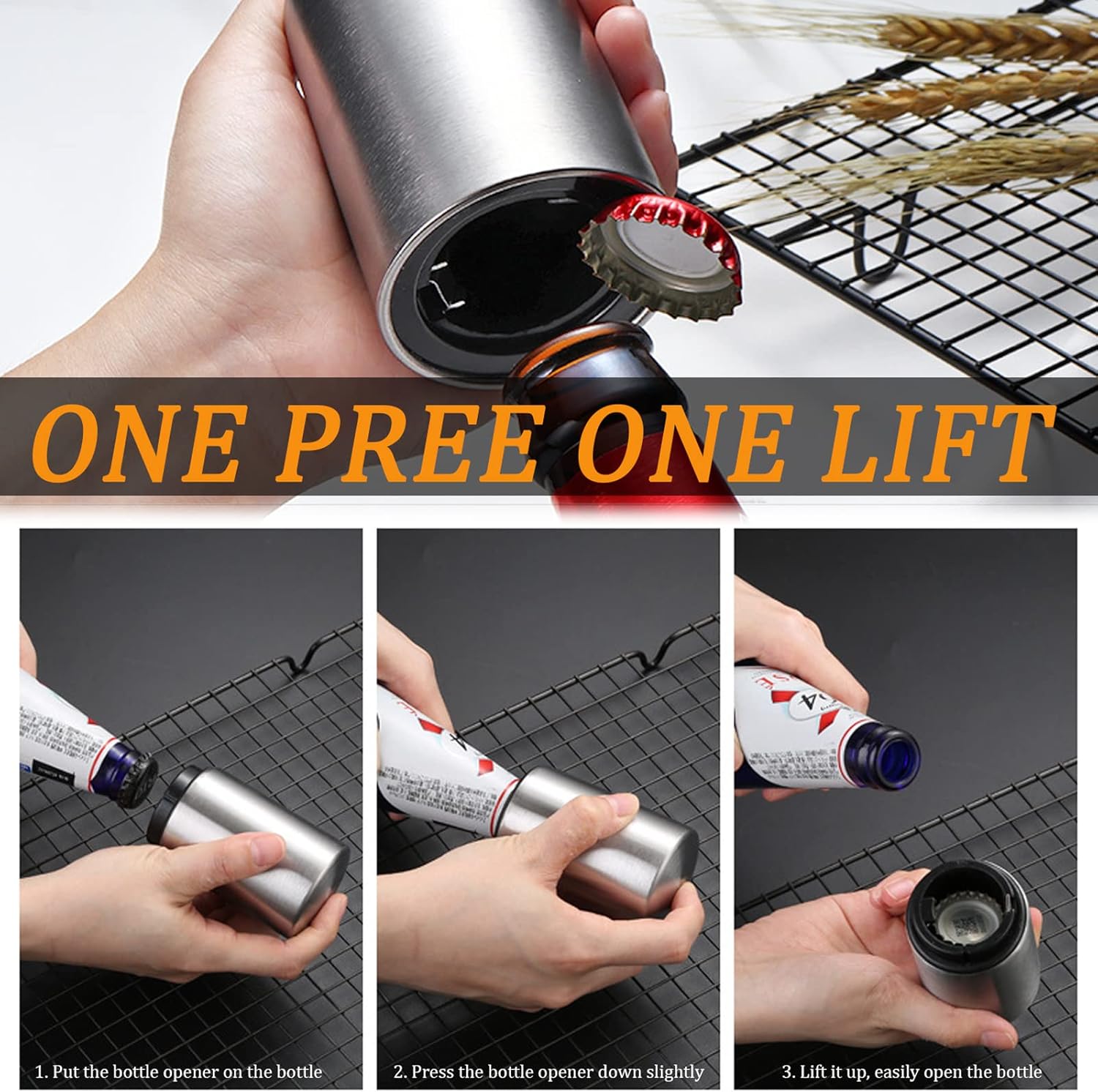 • STURDY & EXQUISITE - This magnetic automatic push down & off beer opener is made of high-quality stainless steel, went through wire drawing treatment, made the beer cap opener LONG-LASTING. So this bottle opening tool has good handing feeling, and easy to clean. At the same time, the auto bottle opener looks delicate and fashion. The beer bottle cap opener is not only a practical and sturdy beer bottle opener, but also a delicate decoration for your kitchen. Love destapadores de cerveza!