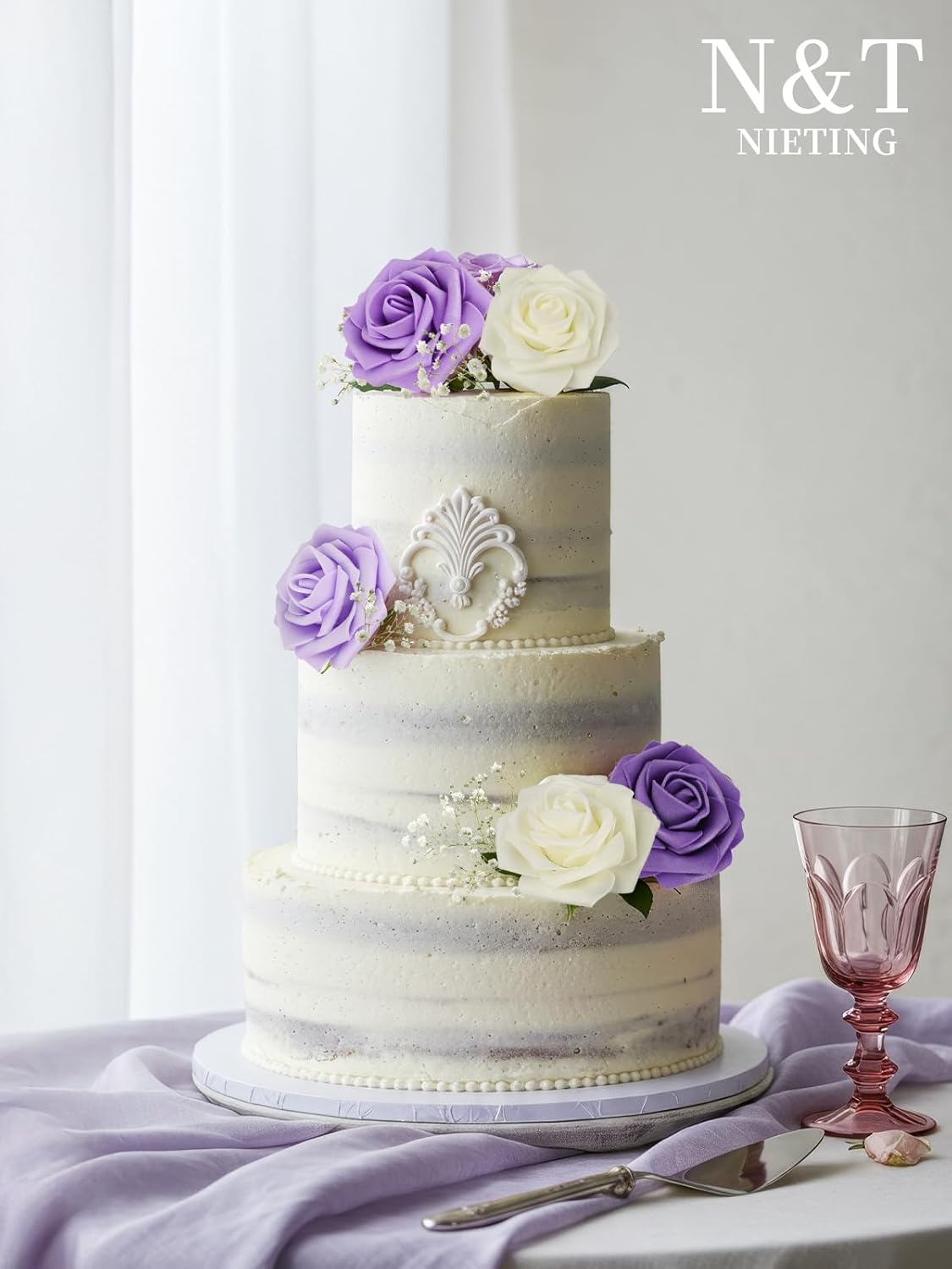 N&T NIETING Artificial Flowers 50Pcs Fake Foam Rose Purple Flowers with Stems Lavender for DIY Wedding Bridesmaid Bridal Bouquets Centerpieces Party Home Decoration(Series Purple)