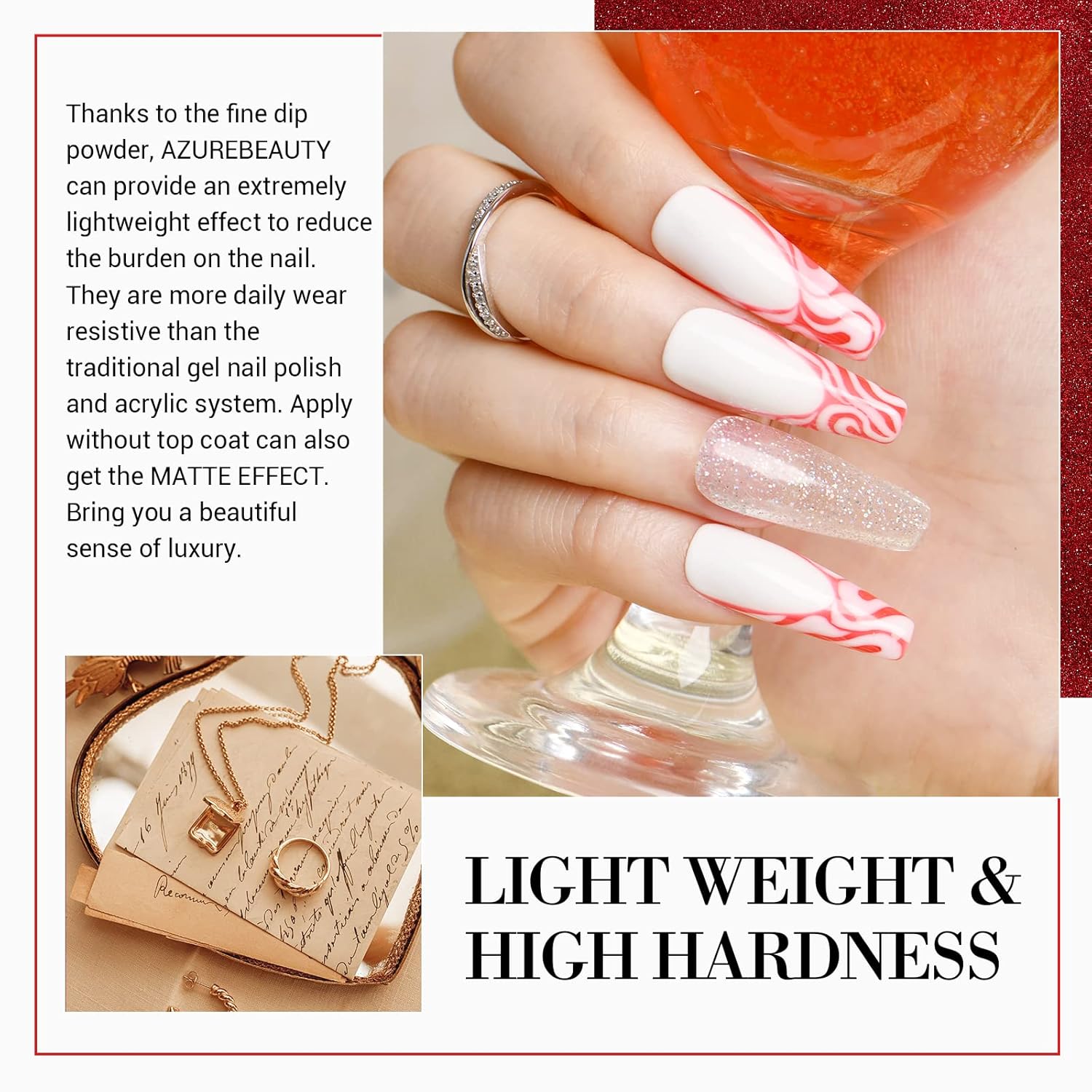 • No Need Nail Lamp Curing & Easy Application: AZUREBEAUTY dip powder nail starter kit doesn't need a nail lamp to cure, and dry faster and is skin-friendly, which can avoid turning skin black and damaging nails. Easy to apply, suitable for beginners and professional nail salons