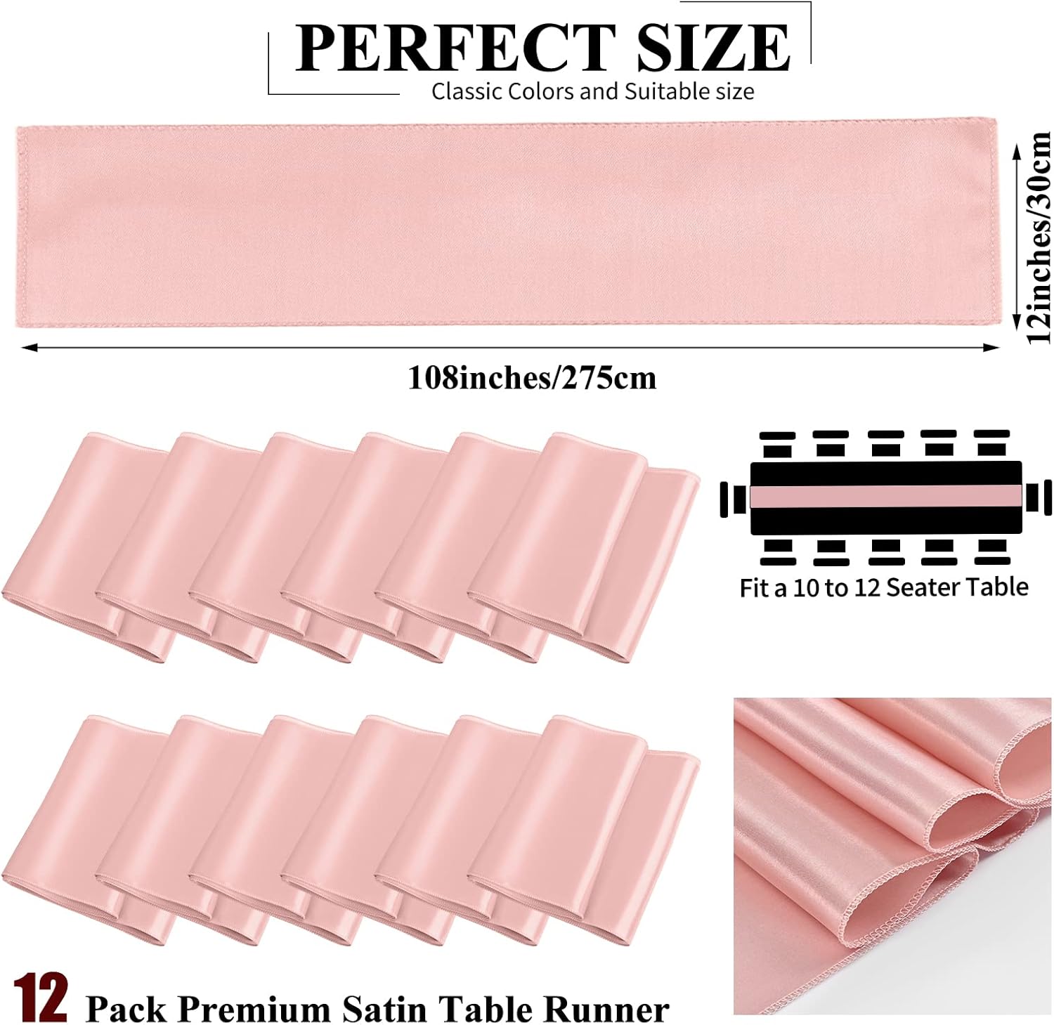 • 🍰【Set includes】12Pack rose gold satin table runner measures 12" x 108" in size, appropriate for a table that can seat 8-10 people. This satin table runner can fit a 6ft/8ft rectangular table or round table well.This satin table runner is great for event table decorations.Our satin table runner make your dining table more dazzling and outstanding.Purchase our 12piece satin table runner and save even more.