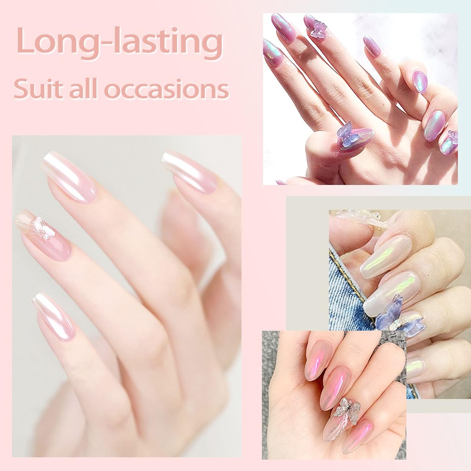 • Amazing Chrome Effect: It is an ideal chrome nail powder kit to create a aurora chrome effect. Different basecoat color leads different effect., suitable for pearl nails, candy/ice/glass effect nails, mermaid/unicorn effects, mirror effect nails, or opal nails. Create your unique nails art with Allstarry white chrome manicure pigment.