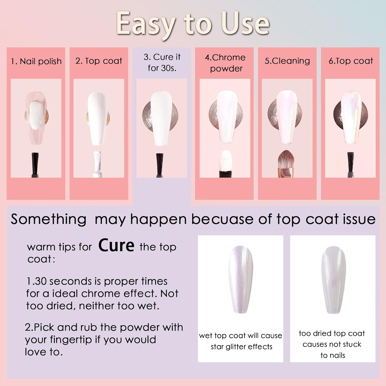 • Easy to Use: The chrome powder stuck well to the nails that applied No-wipe Top Coat. You can easily get salon-quality chrome results. To make it easy to use the powder, we provide detailed steps and tips in the images. Use it and try more DIY nails with chrome hearts nail charms, flatback rhinestones, and nail stickers.