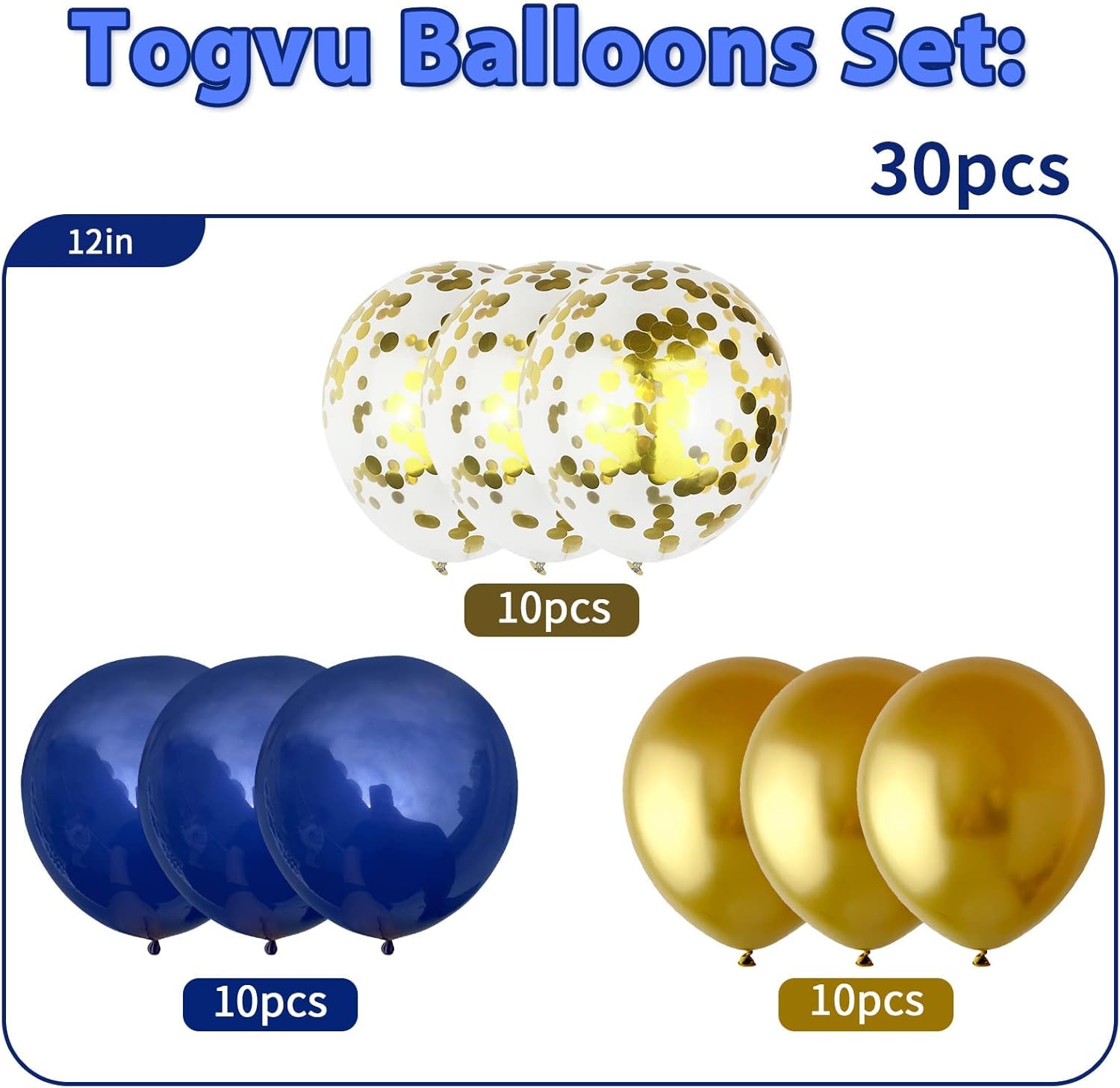 • πŸŽˆγ€Navy Blue Gold Balloons Set】You will get 3 different colors of 12 inch balloons, metallic gold 10 pcs, transparent navy blue 10 pcs, gold confetti 10pcs, total 30 pieces, with 1pc blue balloon ribbon.