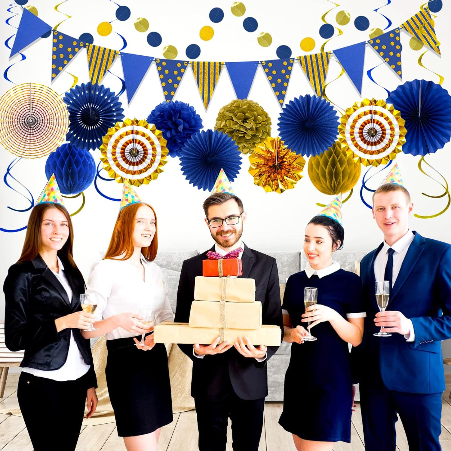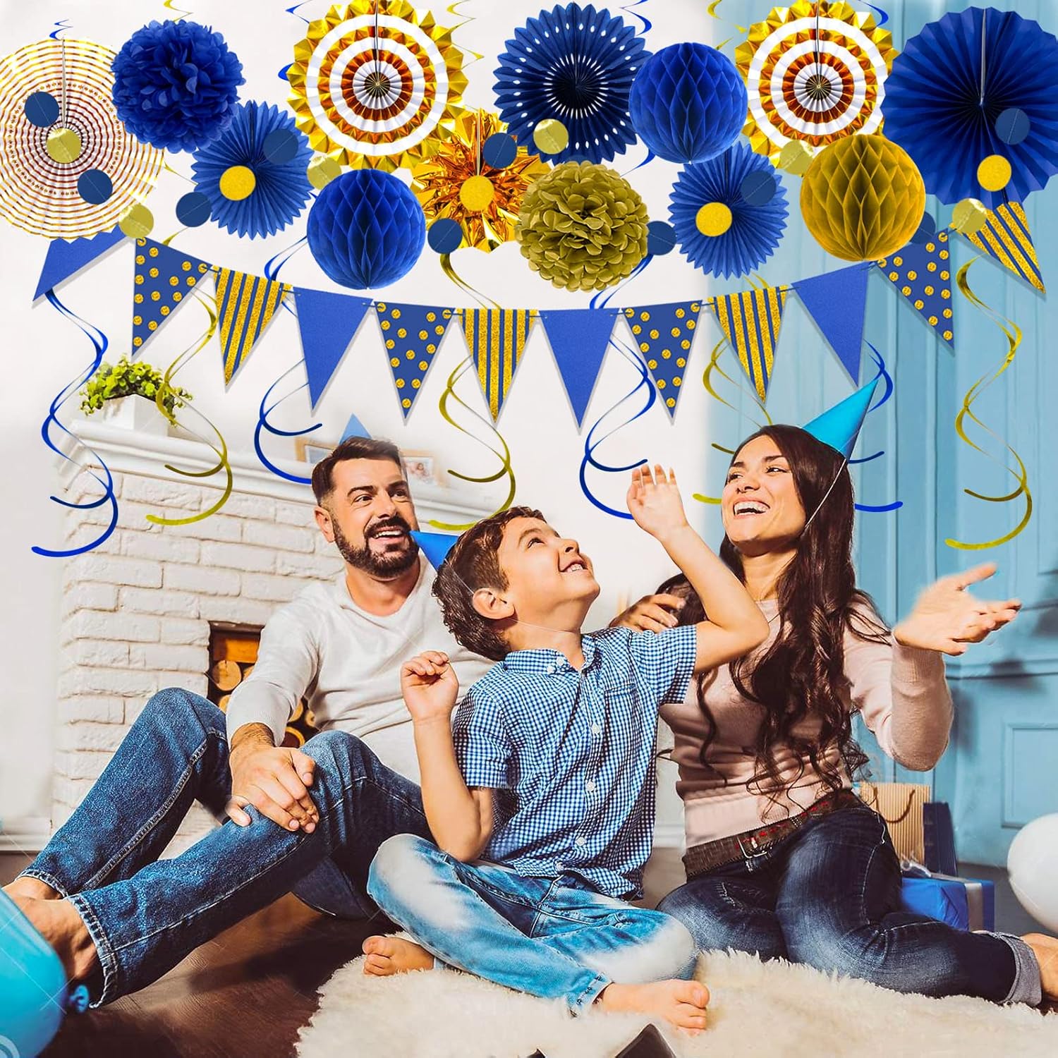 • Blue gold party - blue and Gold Party Decorations with 1 8.2' Triangle Flag Banner, 3 blue Gold Hanging Swirls, 4 8" Honeycomb Balls, 4 8" Paper Pom Pom Flowers, 8 Different Sizes Hanging paper fan. The color combination is very unique.