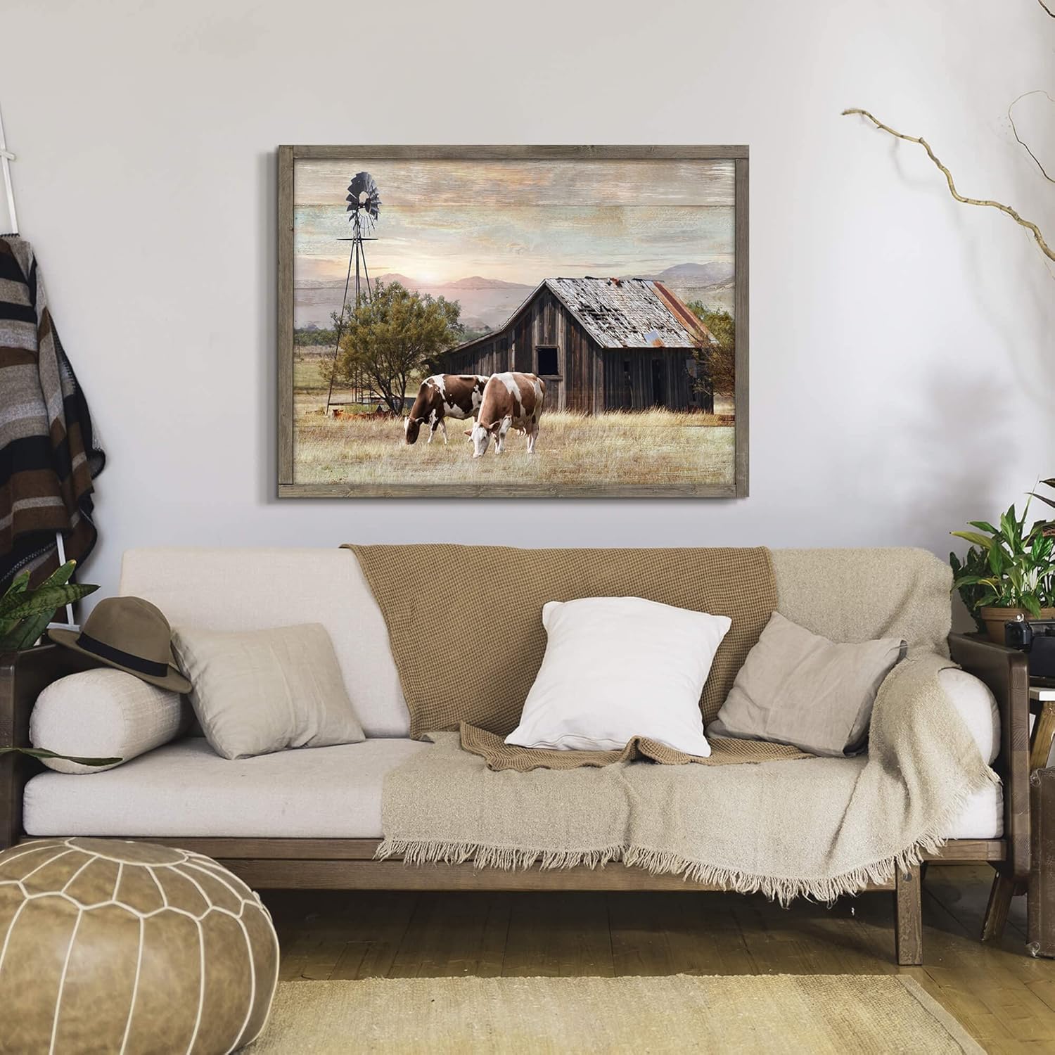 Rustic Wall Decor Barn Framed - Vintage Farmhouse Cow & Windmill Landscape Picture Artwork for Home and Kitchen