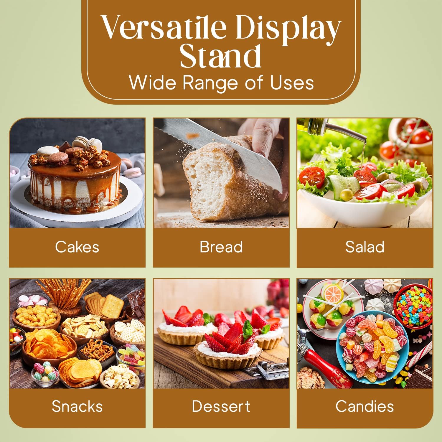 • MULTIFUNCTIONAL โ€“ This six in one multipurpose acacia wood cake stand with lid is a unique cake stand with many functions and uses. Use it as a Cake plate, cake tray, serving dish, punch bowl, chips and salsa plate, salad bowl, and baking goods stand. Simply invert the dome or plate to create any type of serving dish. This spacious 12-inch cake stand with dome lid is designed to display bakes up to 4 inches tall.