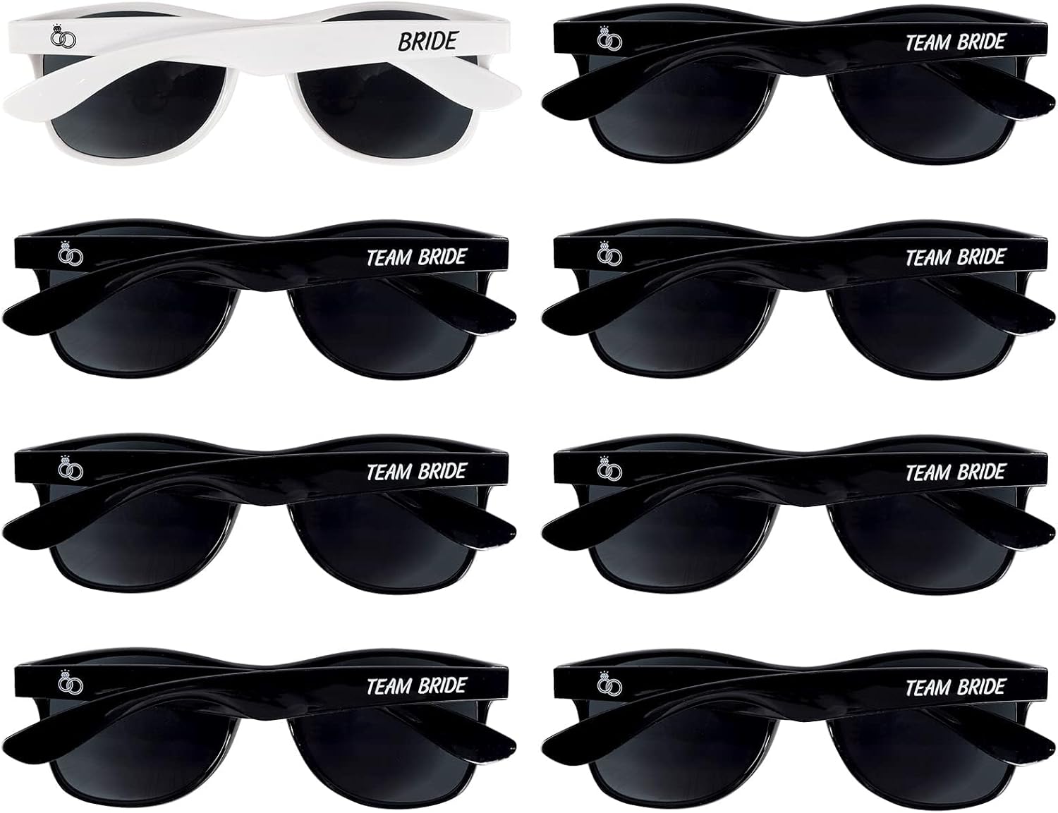 • ๐Ÿ•ถ๏ธ PACK INCLUDES: One white pair of "Bride" sunglasses & seven black "Team Bride" sunglasses with a wedding ring image on the opposite side of the glasses. Plastic frames and lenses have scratch resistant coating - surprisingly durable for the price.