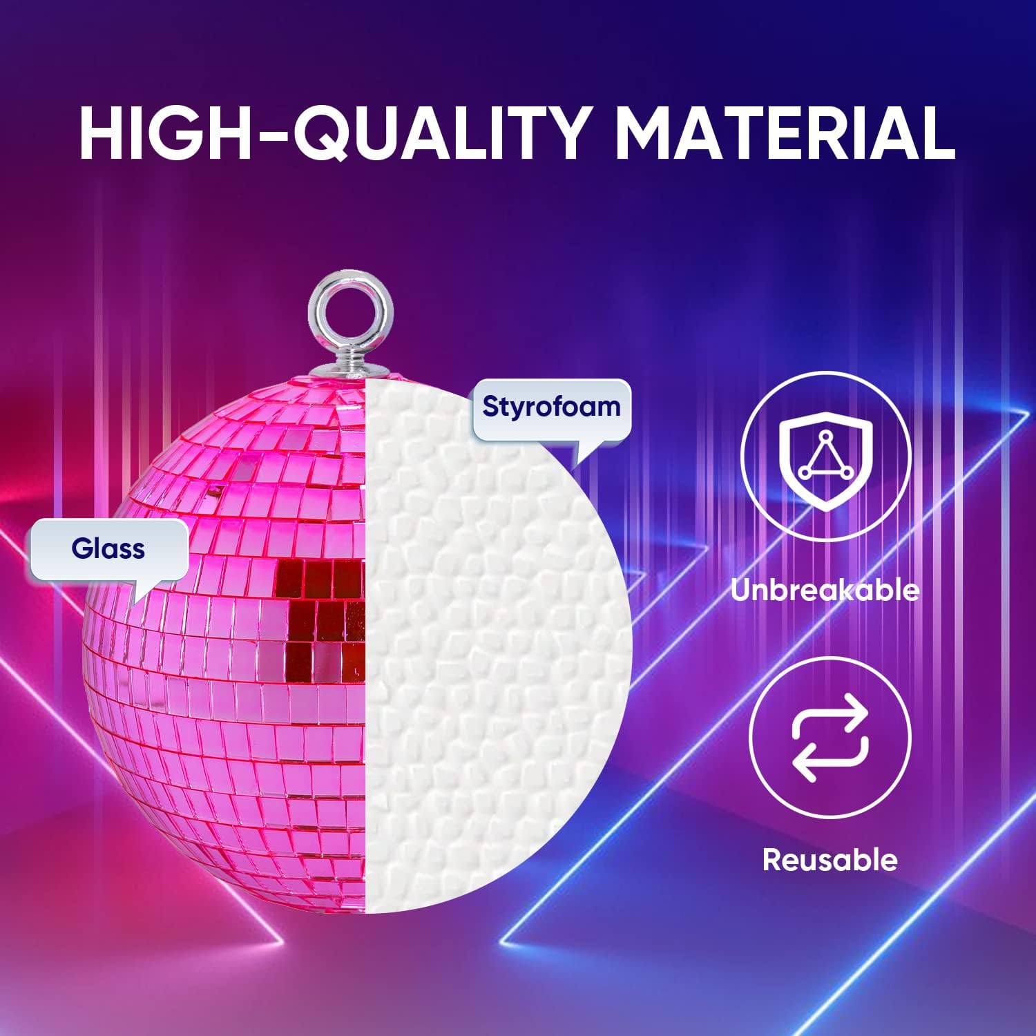 • Premium Silver Mirror Ball: 6 inch disco mirror ball is well-constructed with foam inner ball covered by solid glasses tiles for a shiny lighting effects, which can secure mirror on the right place without moving, lightweight and easy to install