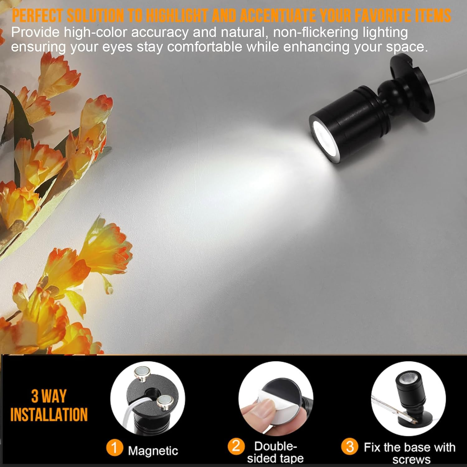 • 【Effortless Installation】Experience hassle-free installation with our mini spotlight kit. Included in the package are adhesive metal plates, magnets, double-sided tape, and screws, giving you multiple installation options. You can place these tiny lights anywhere you desire, making it a simple plug and play process.
