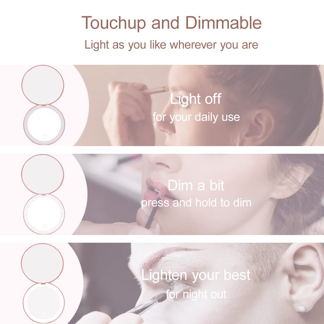 • 【Rechargeable LED Compact Mirror】: Lighted compact mirror with LED light is rechargeable. Soft LED ring light simulates daylight help you to create the flawless makeup. Elegant design for all the occasions such as daily use, party, date or travel.