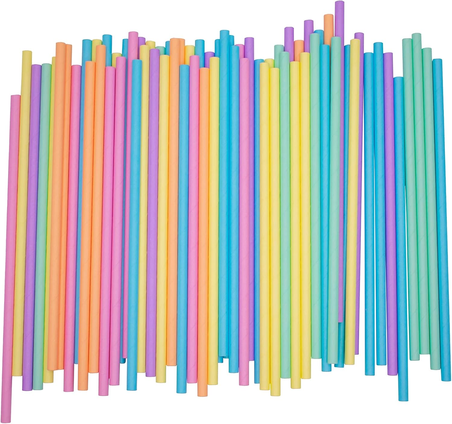 • Pack of 300 Assorted Pastel Orange, Purple, Pink, Blue, Green & Yellow wrapped paper straws that are 7.75” long and have a diameter of 0.25”. Made with 4-ply paper which translates into thicker and more resilient straws that won’t wilt or change shape in both hot and cold drinks.