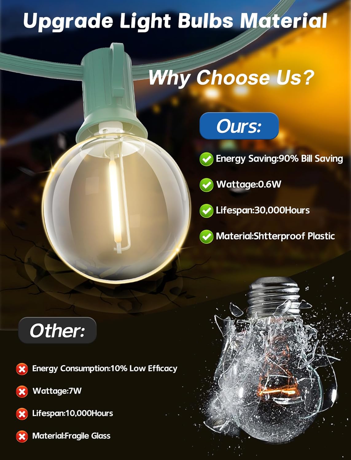 • Shatterproof & Dimmable: G40 LED Christmas lights are made of plastic which much shatterproof than traditional glass incandescent lights. Low working temperature, safer to touch. Outside Christmas lights are dimmable, dimmer is required for dimming(NOT Included dimmer). Globe lights outdoor are perfect for permanent outdoor lighting