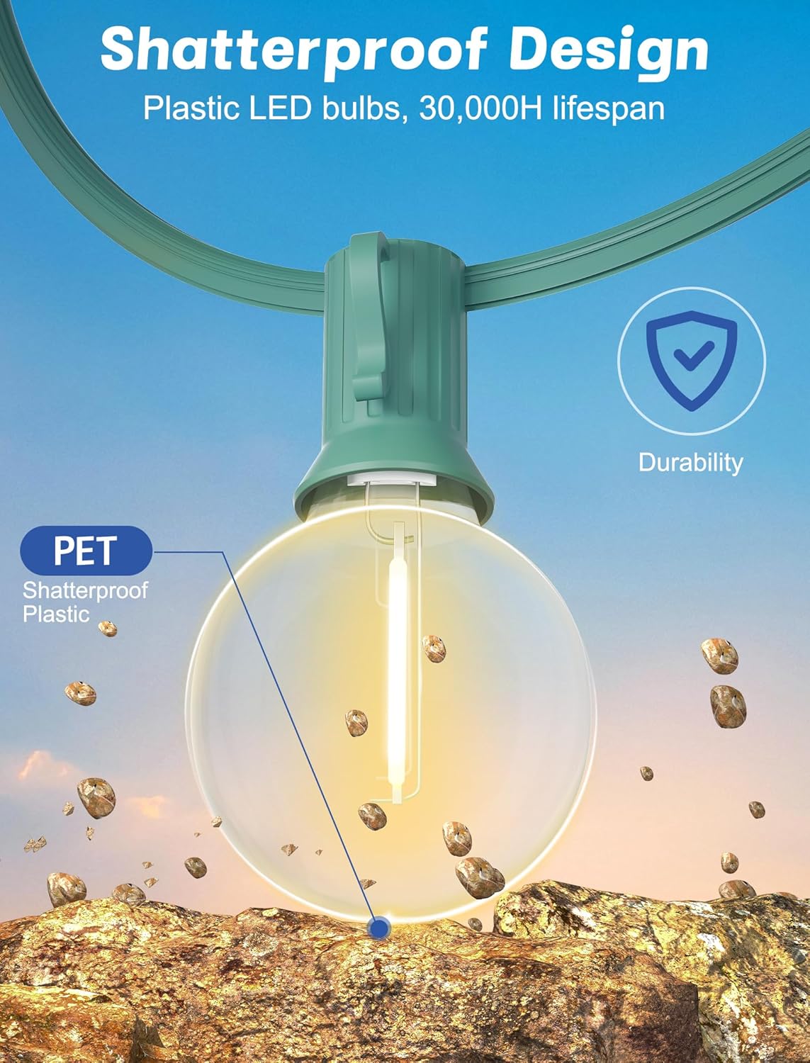 • Connectable Round String Lights: The G40 LED Christmas patio lights is designed with end-to-end connections, you can connect 28 strands at most to cover a large area. green wire string lights can withstand extreme temperatures, rain, wind or wet weather. Unlike traditional ropes, globe Christmas lights outdoor are more durable and can be used indoors and outdoors in all seasons for many years